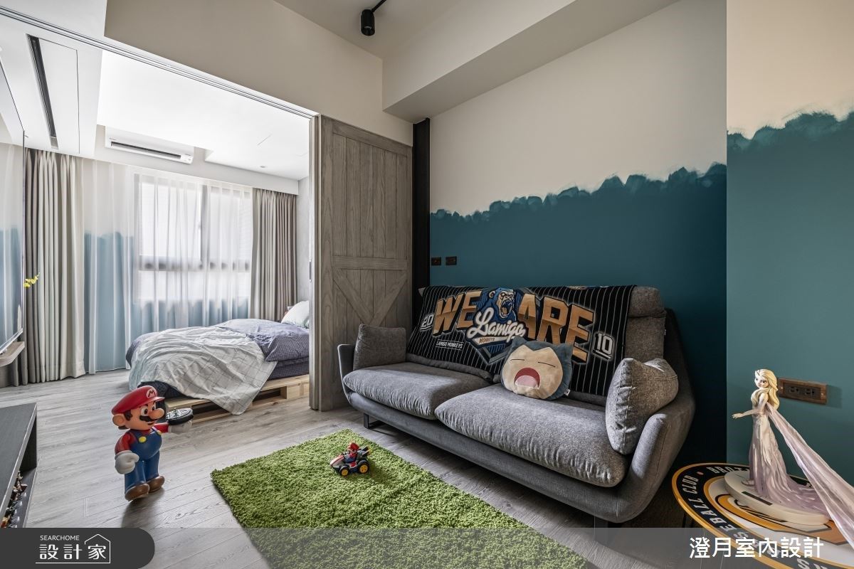 臥室與客廳以半開放式設計,放大空間感,中央的拉門富有美式穀倉意象,白天將拉門拉開,即可將自然採光引入公領域。位於廊道盡頭的更衣間選用輸出貼紙與屋主喜愛的棒球串連,為將機能最大化,選用複合式概念將更衣室與儲藏室整合,多元的收納型態滿足屋主各式需求,東西再多也不用擔心放不下!