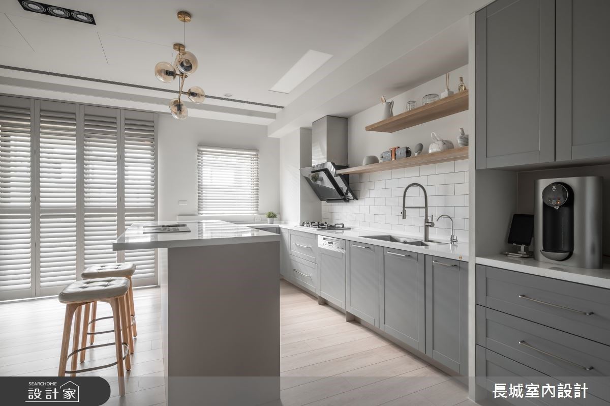 客廳與餐廚區中間做了一道玻璃拉門,可以完全收折到牆面內增加空間彈性,刪除一樓公共區域的客房,將廚房空間加大規劃成L型廚房搭配中島吧台,白色地鐵磚鋪陳防濺板,以木質層板取代厚重的廚房上櫃,形塑視覺與動線兼備的夢幻料理空間。主臥打破套房設計概念,整合美式更衣間與衛浴;男主人專屬的辦公區牆面使用莫蘭迪藍,規劃大型工作台面可同時擺放下兩台電腦,打造既可以辦公、也能休閒的獨立空間。