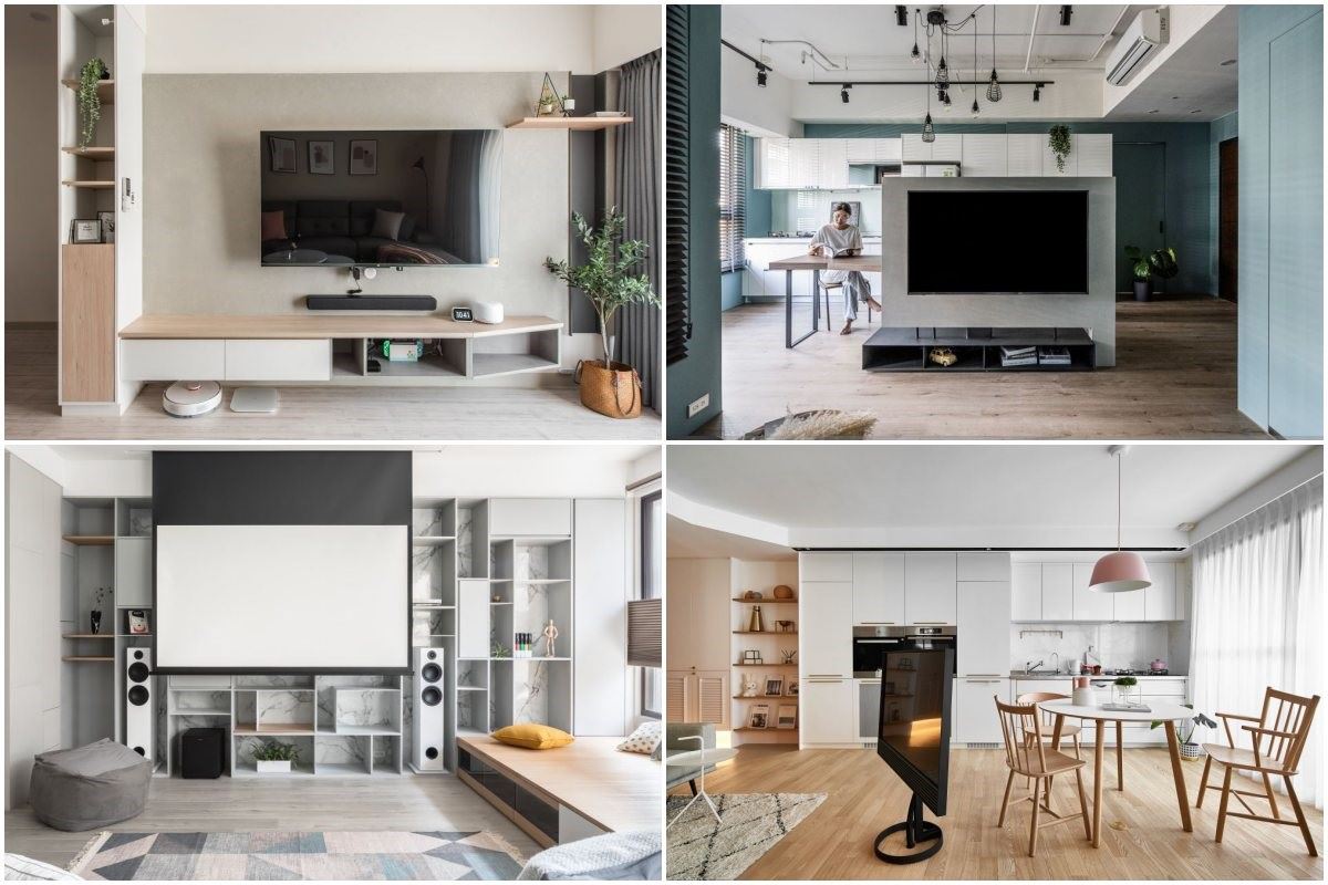 如果覺得半高電視牆還是太佔地坪,那現代許多小坪數住宅也有更聰明的電視選擇!打破電視只能坐在固定地方觀看的限制,旋轉電視柱(架)的設計可以擴充觀影視角,尤其現代人主要生活空間可能不在只是客廳,廚房吧台、餐廳工作桌等等都是休憩空間,可以360度活動的旋轉電視柱(架)就可以讓家裡只裝一台電視但走到都可以享受大螢幕。而且旋轉電視也有許多形式,單支柱狀、整合鐵架、或鑲嵌在電視半牆之中,不僅功能強大又能增添居家造型。