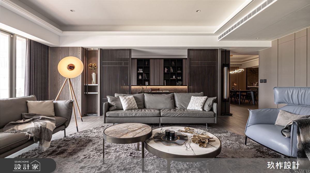 入門玄關處鋪敘深色調石材肌理,營造回家後沉澱安穩的心緒,同時前方處規劃外出衣帽間,使整裝外出的動線更加方便順暢,最後為了豐富立面設計,內嵌線性鍍鈦金屬,讓俐落分明的直線律動遊走其中;邁入敞亮公領域,場域色彩改以深色木質為基底,營造居家空間所需的暖度,其次敞開客、餐廳兩大生活空間,更以木質格柵拉門圍塑書房場域,將彈性隔間運用於此處,不僅化身沙發背牆的視覺端景,更可依據屋主需求彈性調整書房型態,無形中凝聚了一家三口的情感交流。
