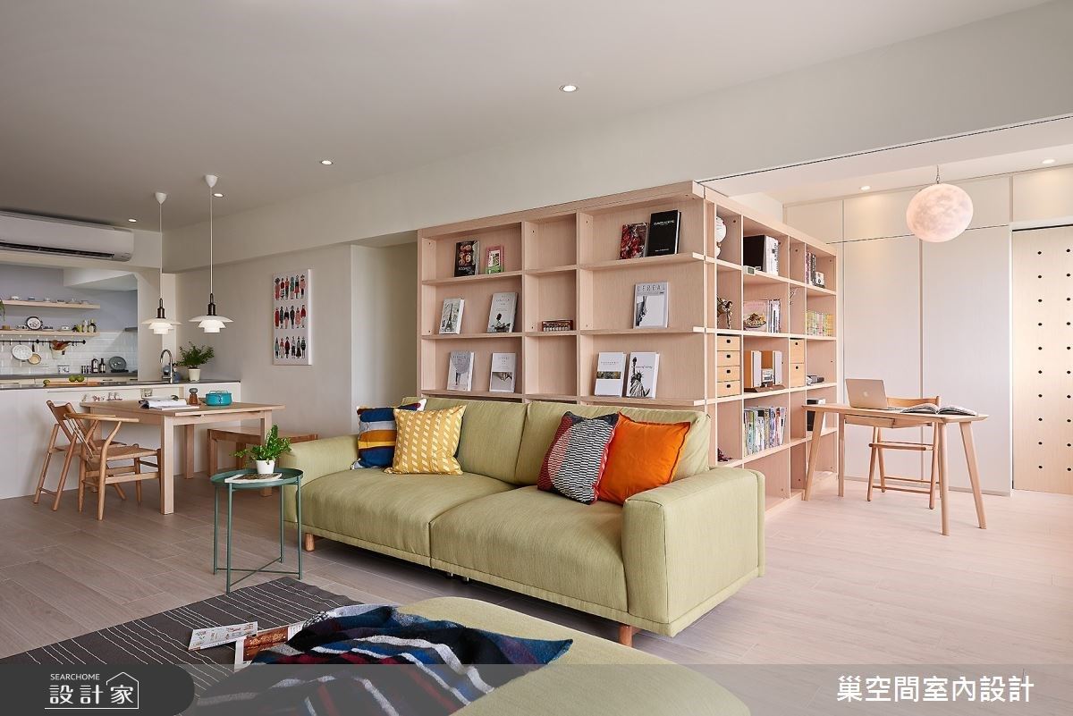 公領域以淺色木質鋪陳,佐以低色溫光線圍塑溫馨氛圍,客、餐、廚空間為開放式設計,放大空間感,廚房將廚具沿牆面規劃,形成平整的立面,L型收納矮櫃由廚房內延伸至中島吧台,增添小家電收納機能,而中島吧台也可作為備料區,使烹飪過程更加舒適便利。書房以移動式書櫃區隔,敞開時可收納於沙發後方,與書房內櫃體相連,形成俐落的L型設計,同時可將書房內採光引入客廳,增添明亮感,書櫃造型拉門具強大的收納機能,可擺放大量書籍,還可作為公領域端景牆,親朋好友來訪時可將拉門拉起,即可轉變為獨立客房,將通透感與隱私兼具。
