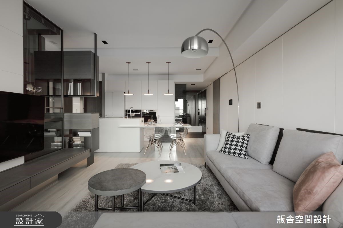 「若非必要,坪數不足不用硬隔到三間房,保留坪數給公共區域或升級臥房和衛浴會擁有更好的生活品質。」新成屋的玄關牆面鋪貼灰鏡,創造更開闊的視覺效果,拆除室內過多的隔間數讓 25 坪住宅擁有寬敞的廳區。客廳電視牆正面不設計任何櫃體,僅以簡約電視櫃創造置物平台;利用廊道轉角訂製櫃體屏風,不僅能跨場域運用,也能讓廚房與客廳在視覺上有一定的遮蔽性。