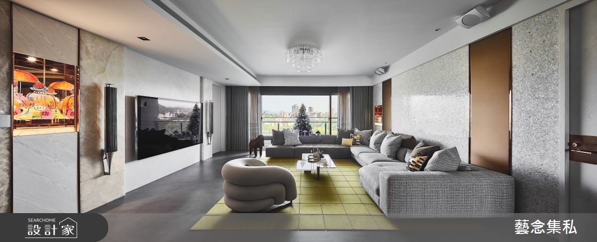 第四度委託藝念集私打造 160 坪住宅,以全客製化概念規劃五房三廳,搭配特殊材質與設計家具,打造出帶有屋主識別的豪邸。有別於一般豪宅梯廳,設計師以宇宙間日月星辰的環形為靈感,鏤空雕刻造型天花板,搭配鈦金屬與嵌燈,象徵延續家族情感的希冀。