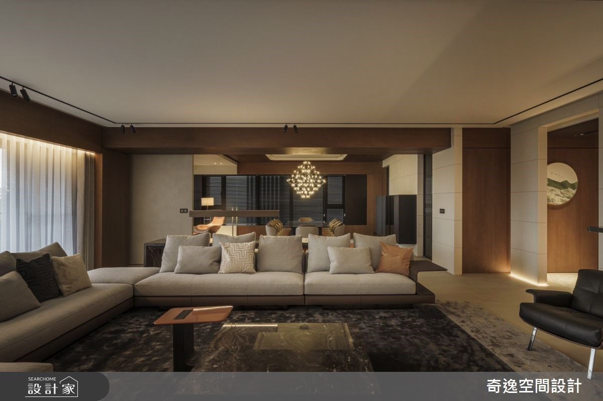 從大門走入空間是一整面的藤編櫃體,既有工藝質感,也具有通風的機能性。轉入客廳安排了一面淺色亞爵石牆面,在牆上開了一道窗,不論在視覺上或是動線都有不同的層次。開放的公領域串聯了客廳、書房、餐廳以及閱讀區,因此特別選用了多面向沙發,讓人能更自由不受侷限地在空間中活動。