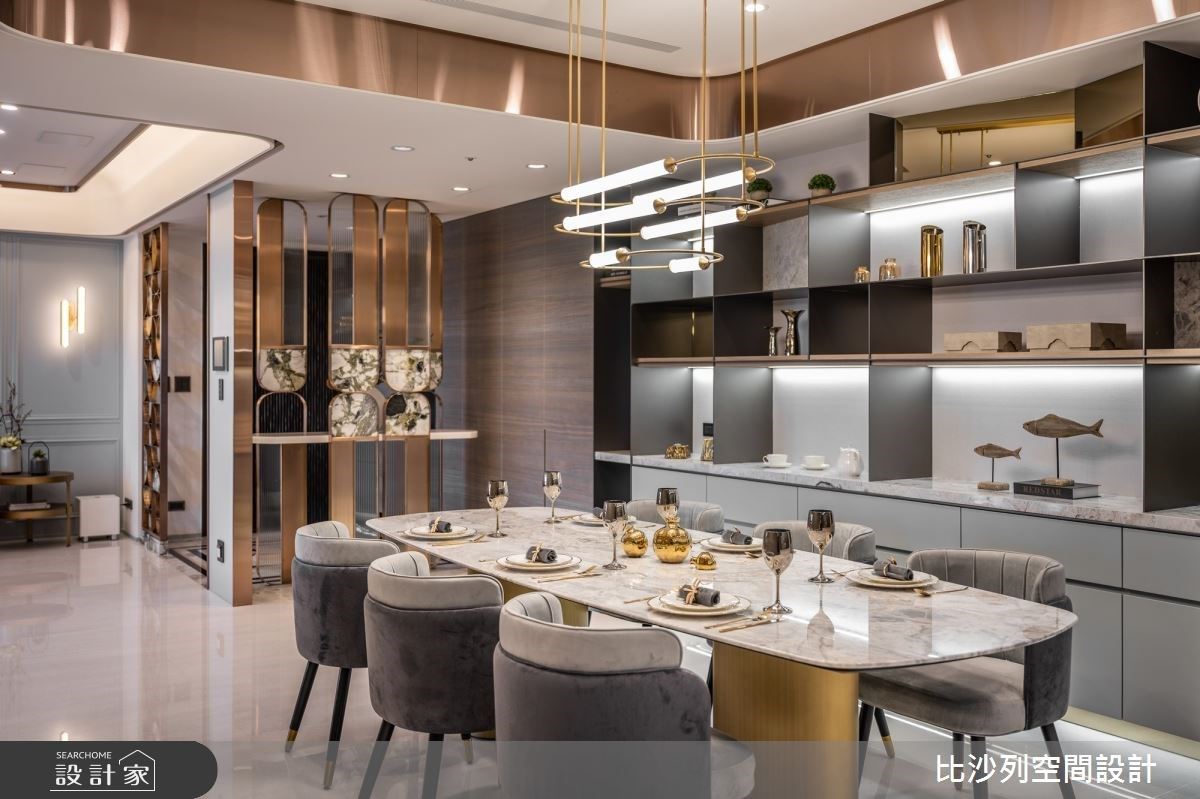 餐櫃延續客廳的調性,以多元材質及色彩豐富牆面,觸感極好的石材檯面上方為開放式的展示格櫃,讓珍藏品更顯高雅,下方的抽屜也滿足收納需求。鋪設木地板的更衣室與天花的深色木紋圍塑溫潤感受,結合鐵件、鍍鈦金屬、石材,滿足衣物吊掛、展示、分類,美觀與實用兼具。