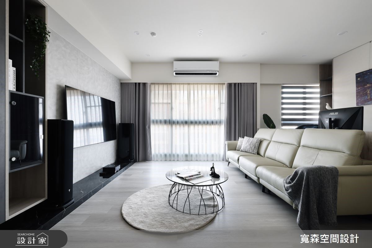 簡潔又富有設計感的俐落線條是屋主平日休憩觀賞影音的空間,搭配迎光落地窗扇增加室內採光。米白的皮質沙發與淺色系耐磨木地板相呼應,創造視覺空間延伸,與之相比鄰的收納櫃體以懸吊式手法打造輕盈感。