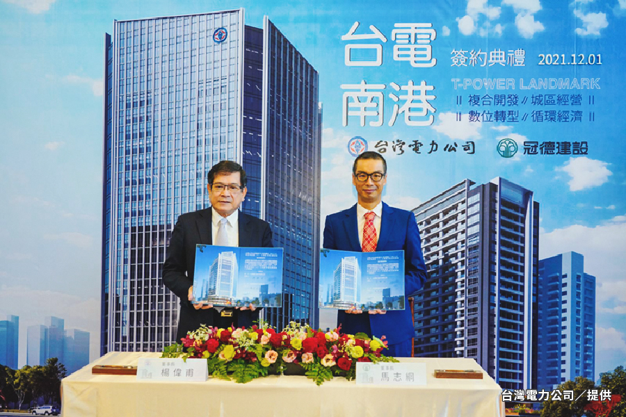台電今年9月完成北部儲運中心南港舊址都更案公開綜合評選作業,並在今天舉行簽約儀式,由台電董事長楊偉甫、冠德建設董事長馬志綱共同簽署。