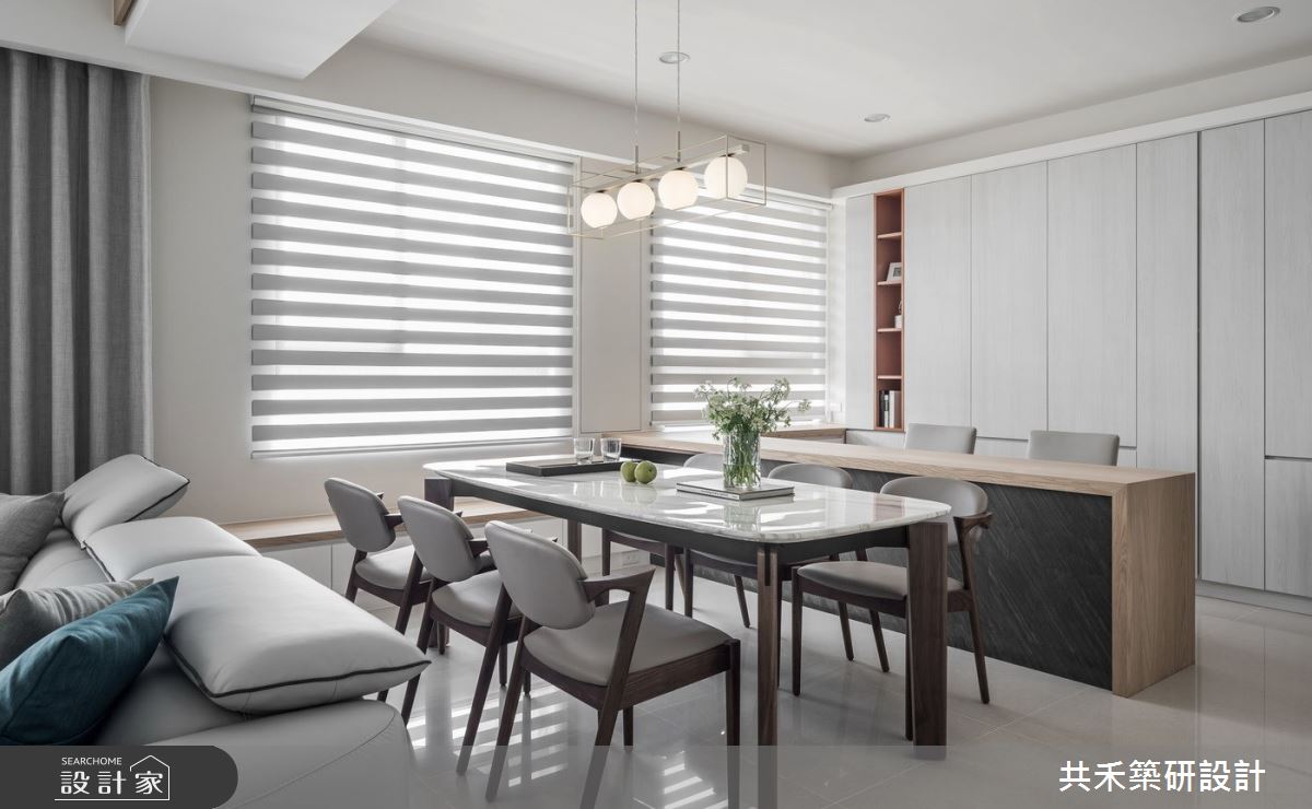 玄關收納櫃延續視線與動線,一路串連客廳石紋電視牆,儲藏空間得到了整合,視野也無限延長。開放式的格局設計,將客廳、餐廳、書房依序規劃在同一軸線上,機能各自獨立卻又能相互交流,搭配白色與木質元素安排、整齊的收納設計,簡練而溫潤的空間感,寬敞且順暢的動線,亦便於未來行動,貼心著想各種生活可能,讓生活無後顧之憂。此外,臨窗處特地設計長型臥榻座位區,打造多重放鬆座位,休息多了選擇,親友聚會也不怕座位數不足。