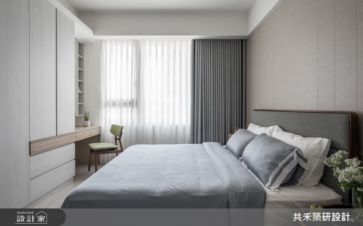 臥房設計從油漆的選擇、木質比例的增加及寢具色彩的挑選,看到更多溫潤、沉靜的元素;收納設計上,也運用更多整合概念,發揮各個房間的最大坪效,打造舒適與機能兼具的私領域。