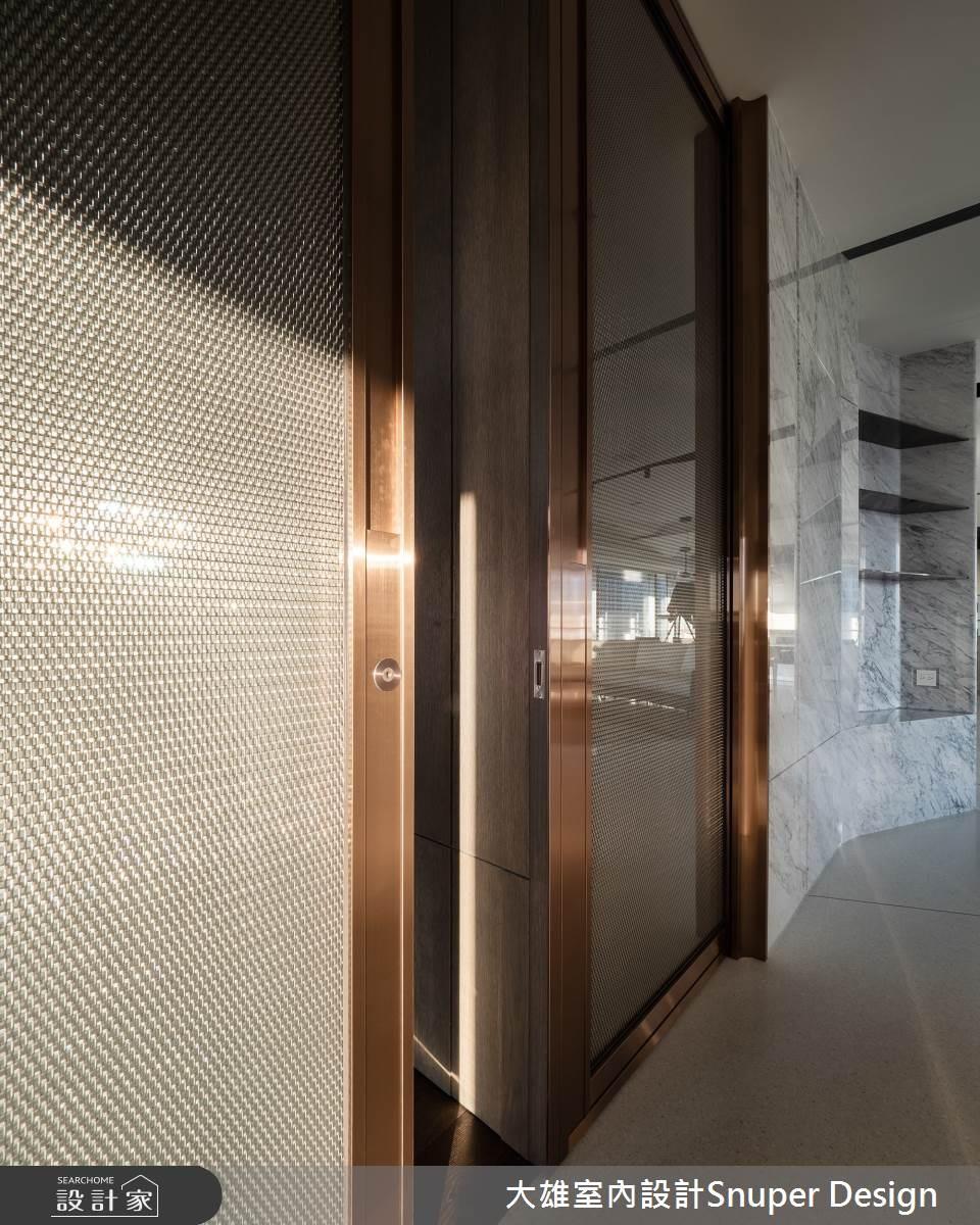 書房區域是一處轉折進私領域的彈性之所,採用推拉門和拉折門結合的兩種形式,確保空間的多元使用性。在推拉門的設計上,挑戰將材質以實驗性的方式,重新詮釋經典,將鍍鈦金屬與金屬網,夾於兩層玻璃之中,將過渡區賦予奢華感,並通過豐富感官強化細節與精緻度。
