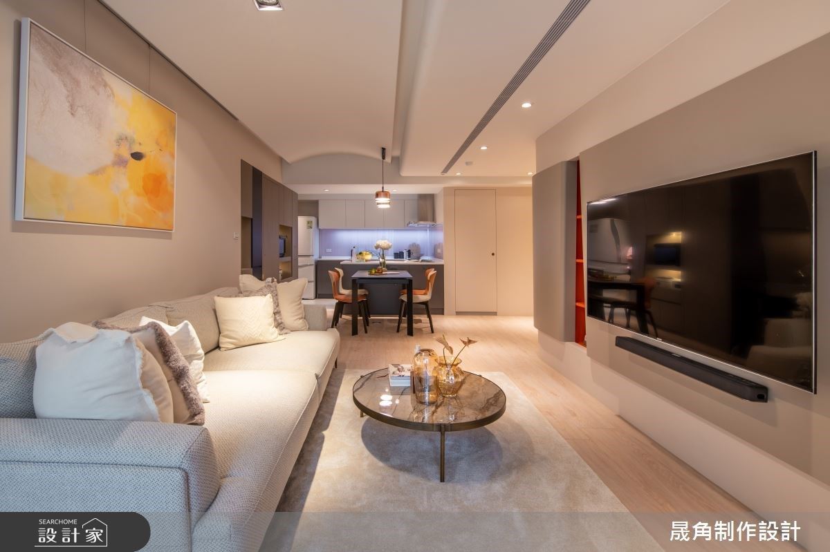 原始的房屋格局是傳統型住宅配置,為了打破舊有的格局思考,設計師將客廳、房間對調,巧妙串連客餐廳、廚房,達到空間開闊效果。而玄關進門處利用弧形,打造櫃體和隔間牆轉角,順勢導引動線,貫穿整體的圓潤氛圍。客廳以親子宅考量,將空間規劃開放式設計,實現家庭的核心區,滿足日常待客、聚會的空間需求。餐廚區將中島和餐桌連結,增強機能性,同時因應居者的品酒嗜好,規劃兩處擺放紅酒與烈酒的酒櫃區,便利居者的酒品收藏。主臥貼心結合居者的運動習慣,於天花加入健身桿,滿足日常的健身需求;主衛浴則採分離式設計,將洗手台外移,使兩者機能不互相干擾,提供多功能使用。