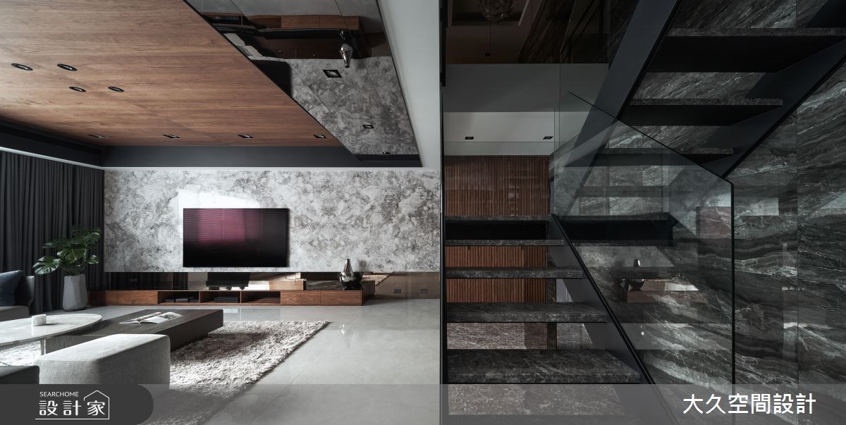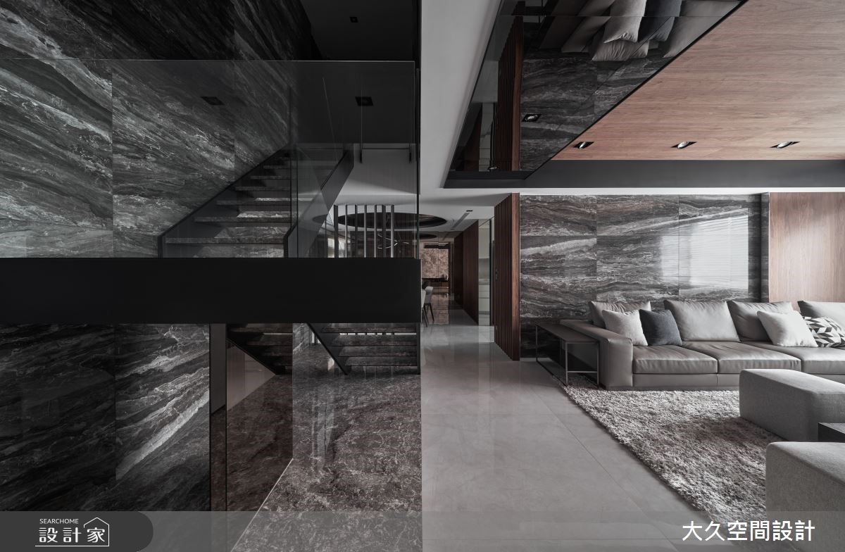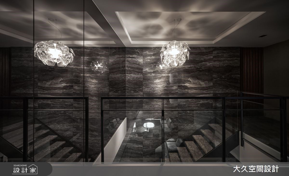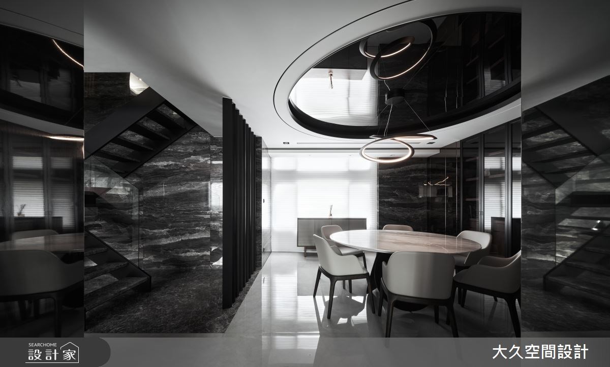 循著溫柔寧靜的木格柵入室,寬敞方正的公領域裡,兩側立面注入渾然天成的大理石材,透過不同的深沈紋理,表現豪宅的大方氣度,更以此拓寬空間尺度,營造視線延伸的空間感。天花設計透過溫潤木質調和鏡面相佐,除了調和石材的冷硬感,鏡面的反射效果也捕捉光影的流動感。連接上、下層的階梯,運用鐵件和玻璃隔間,形塑存在感低、穿透性強的結構,讓視線能自由遊走,並串連起每個場域。餐廳場域,本身因為位於中央導致採光不佳,此次打造開放式的廚房開口,將美好日光帶回用餐時刻,天花造型也對應圓桌,利用圓弧曲線帶入鍍鈦質材,更巧妙修飾壓迫感十足的大樑,無論是宴客、平日用餐都相當舒適自在。