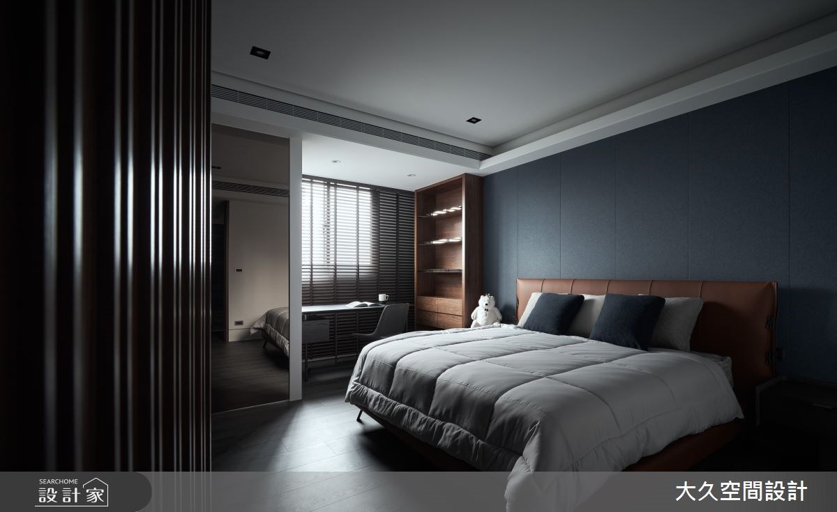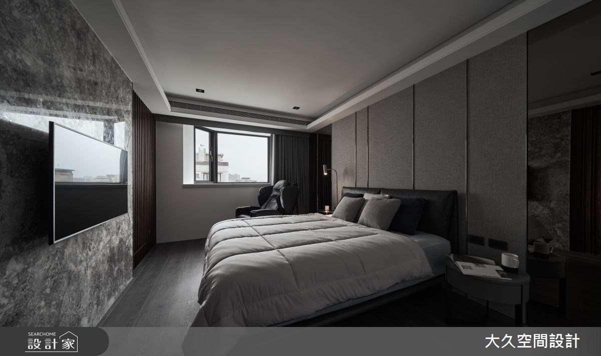 進入主臥,延伸公領域的大器視覺,在石材與木質調的包覆下,搭配柔軟的床頭裱布,詮釋出輕柔無壓的休憩畫面。