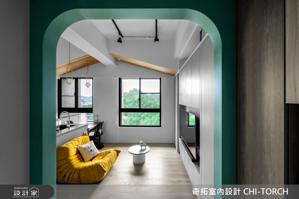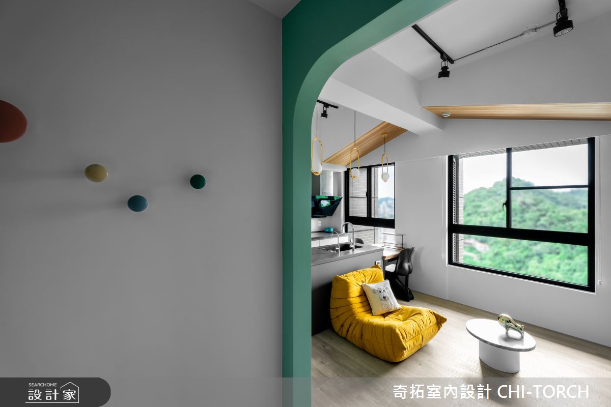入口處透過一道清新綠的拱門,打造沉澱情緒的二進式玄關,並以圓角代替直角,細膩地取景入室,讓人感到心曠神怡。鋪設灰黑磁磚的落塵區,在空間的左右兩側牆面,規劃機能充足的鞋櫃,以及鈕扣造型掛鉤的一日衣櫃,即便是小空間也能透過俐落的設計手法,劃分出功能強大的玄關區域。