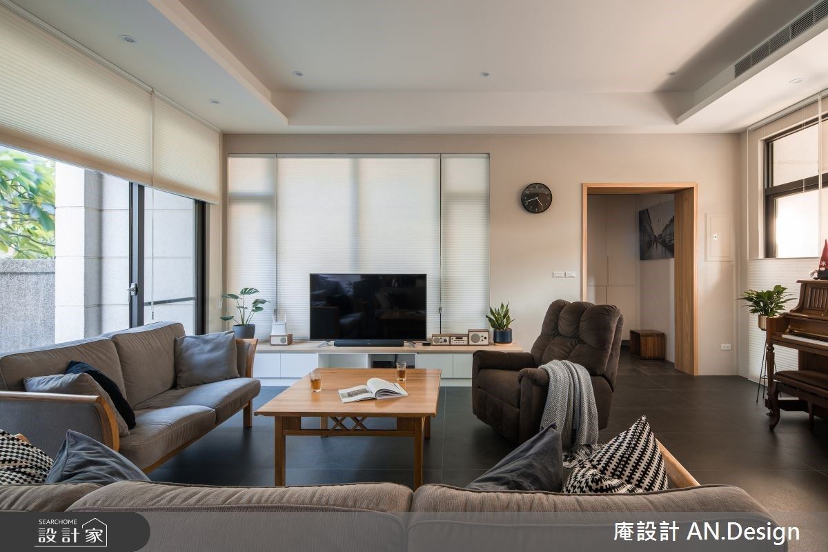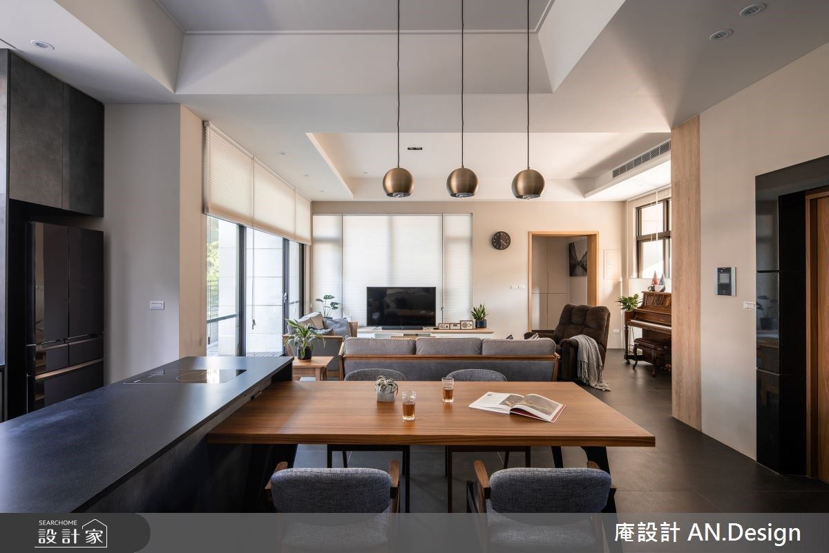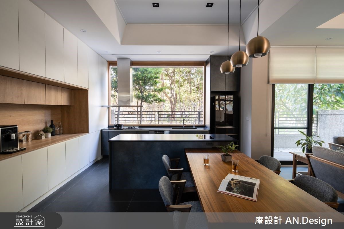 推開大門,全屋以几淨玫瑰白帶出主調,搭配石板地坪創造深與淺的對話。佐以木質調家具配件延伸溫潤和煦空間個性,走入客廳公領域,深褐與淺灰跳色布質沙發奠定空間基調,宛如林間佇立多年的樹木。大片落地向陽窗為室內挹注充沛日光;後方緊鄰著開放式餐廚場域,拉近一家人的距離;備料區面向對外窗,在烹飪的同時也能享受大自然之美。