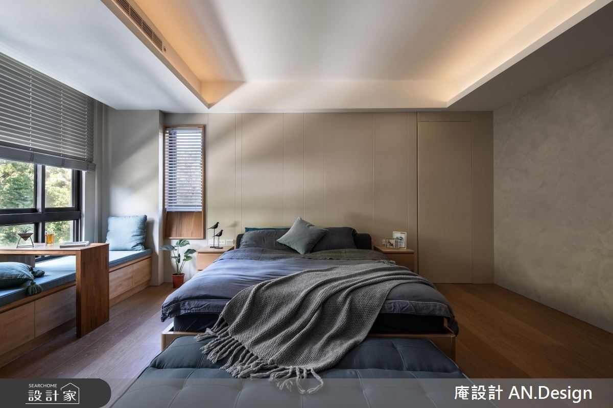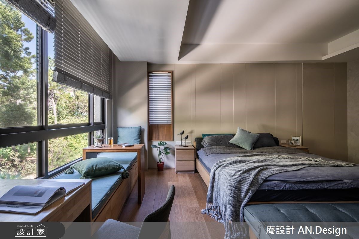 來到主臥私領域,延續室內一貫風格語調以輕柔、減壓的森林系空間配色創造休憩氛圍,臨窗處特別規劃臥榻區及閱讀桌提供多樣彈性空間,搭配同色調潔淨白百葉窗扇調節日光的熱情。