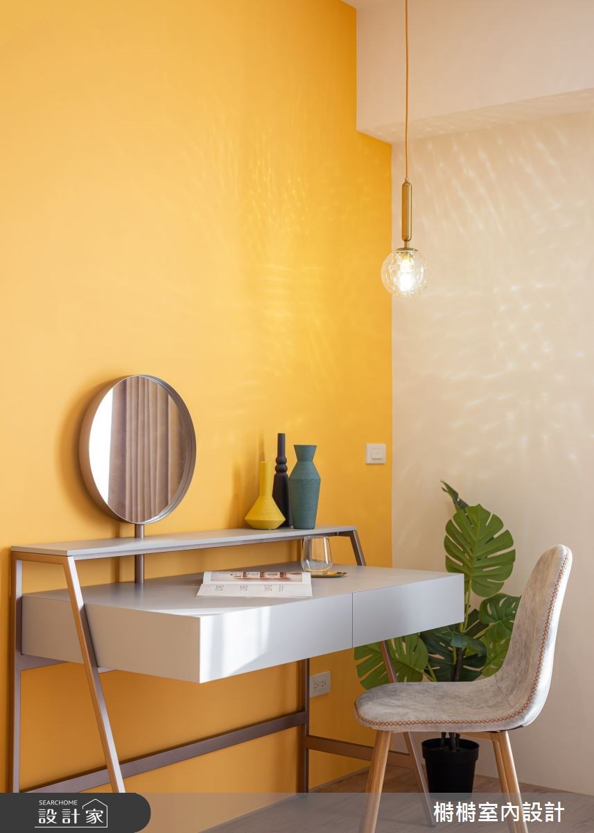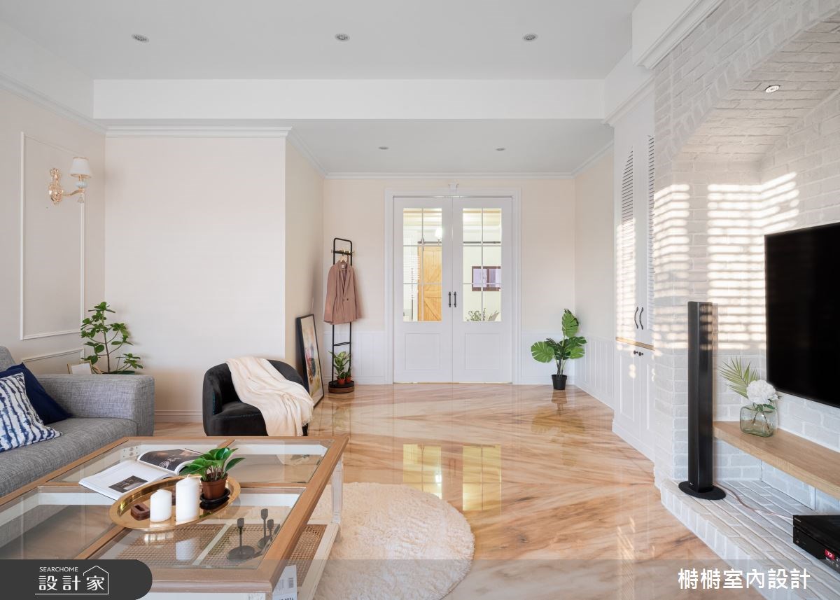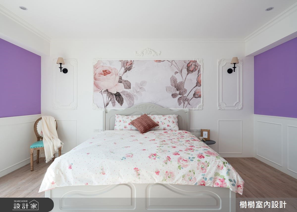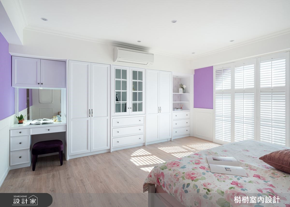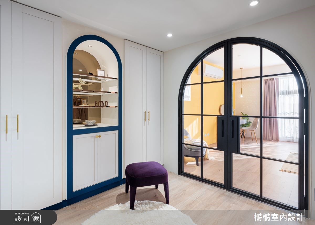 寬敞方正的一樓區域,透過百葉窗將絕佳光感引入室內,立面則以大篇幅留白,傳遞乾淨放大的空間感,僅以簡約的線板語彙留下優雅視角,搭襯對花大理石,打造美式風格的經典與迷人,並適時在居家軟件上以藍白跳色,勾勒南法的夏日印象,或以文化磚鋪陳電視主牆,寫下一絲暖心與質樸,讓每個角度都呈現出特色風景,彼此卻平衡又融為一體。推開雙開的玻璃門扇通往私領域,主臥房大量使用花卉元素,透過線板勾邊迎來玫瑰壁畫,接著以印花坐落在寢飾上,加上薰衣草紫的點綴,一踏入便感受到沁人鼻息的香氣。充滿藝術思維的女兒房,透過拱形的玻璃門刻畫古典感受,內裡則運用高彩度的鮭魚粉,以及亮眼的銘黃色對比,在簡潔的幾何線條和色塊間,反映女兒獨特的個人魅力。