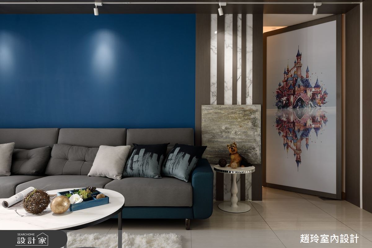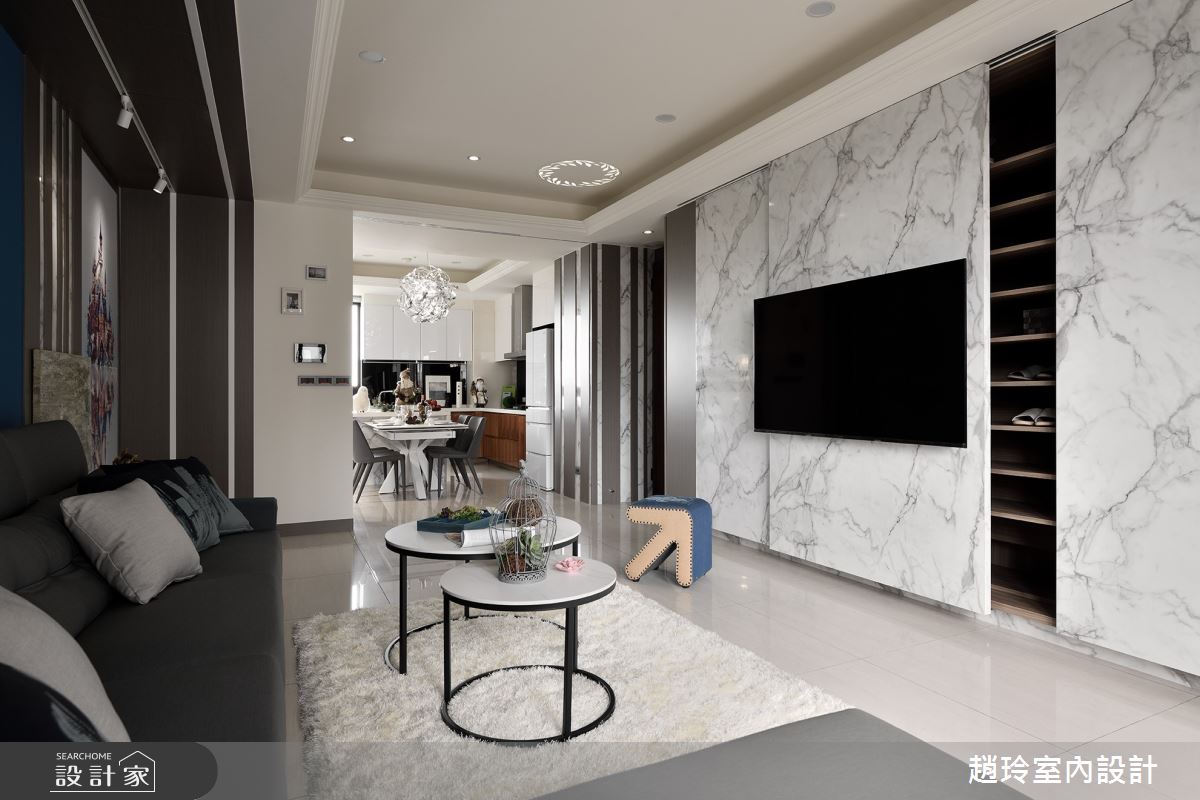 進門處直接就是客廳區域,為了讓空間能具有複數的實用機能,善用推拉門片,整合電器櫃、電視牆和鞋櫃為一體,符合大量收納的需求,同時又不會佔據客廳動線,材質方面則使用仿大理石紋美耐板門片搭配灰色木皮,成為空間焦點。
