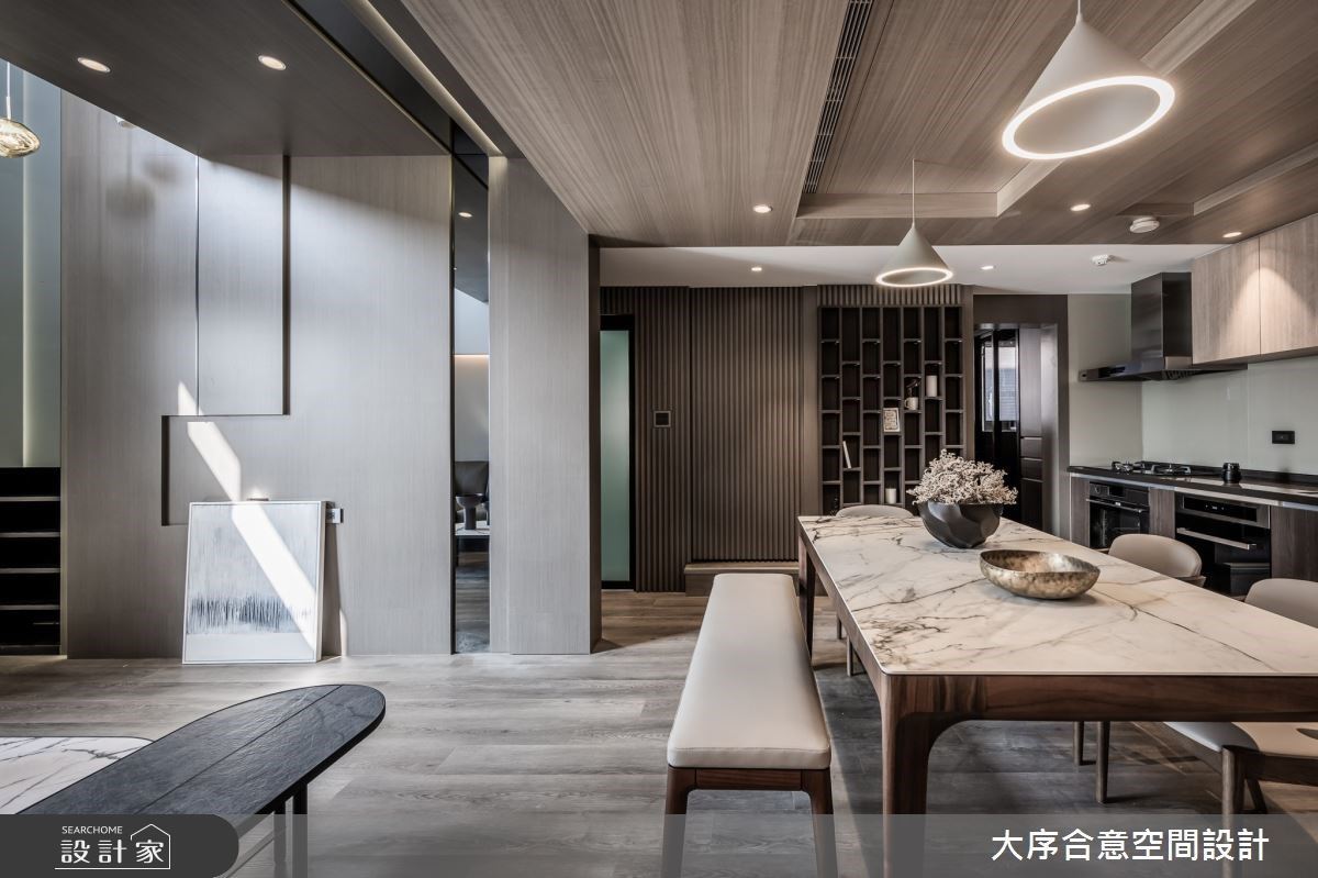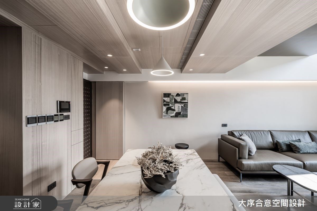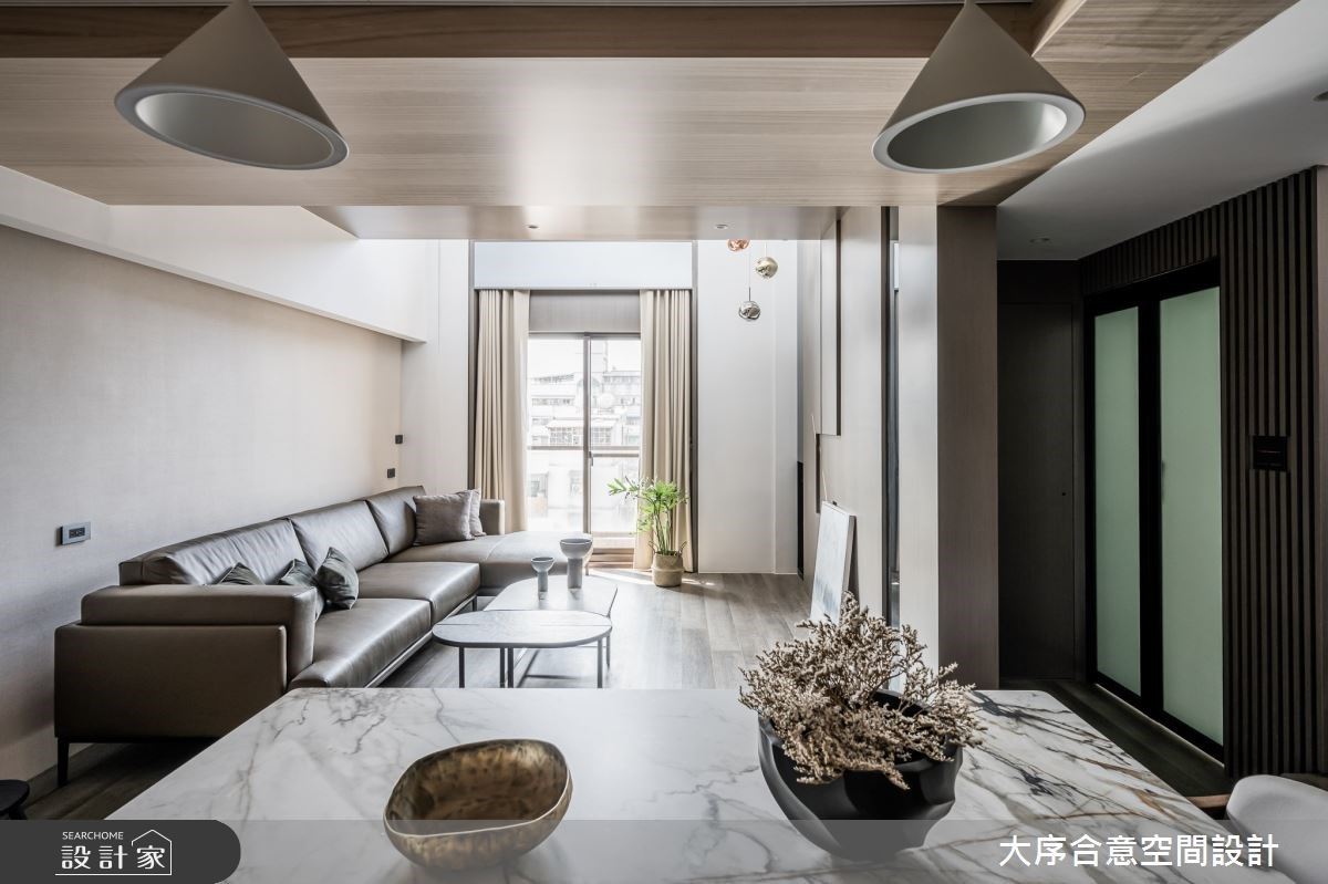 面對一家五口的三層樓空間,羅婉瑜設計師將公領域配置於一樓,並採兩層樓挑高設計,突破單層面積限制,同時營造大面窗景意象。羅婉瑜設計師以屋主喜愛的現代極簡風做空間設定,因此挑高立面藉由垂直、水平線條,來營造極簡俐落效果。電視牆則透過木皮搭配不規則鏡面,來營造現代飯店風的視覺層次。為了復健中的男主人,羅婉瑜設計師還同時考量「無障礙空間設計」,預先規劃輔具行徑動線、尺寸,包含廚房料理、家電設備位置都要做好安全配置與歸納,適時消除生活中的碰撞危機。
