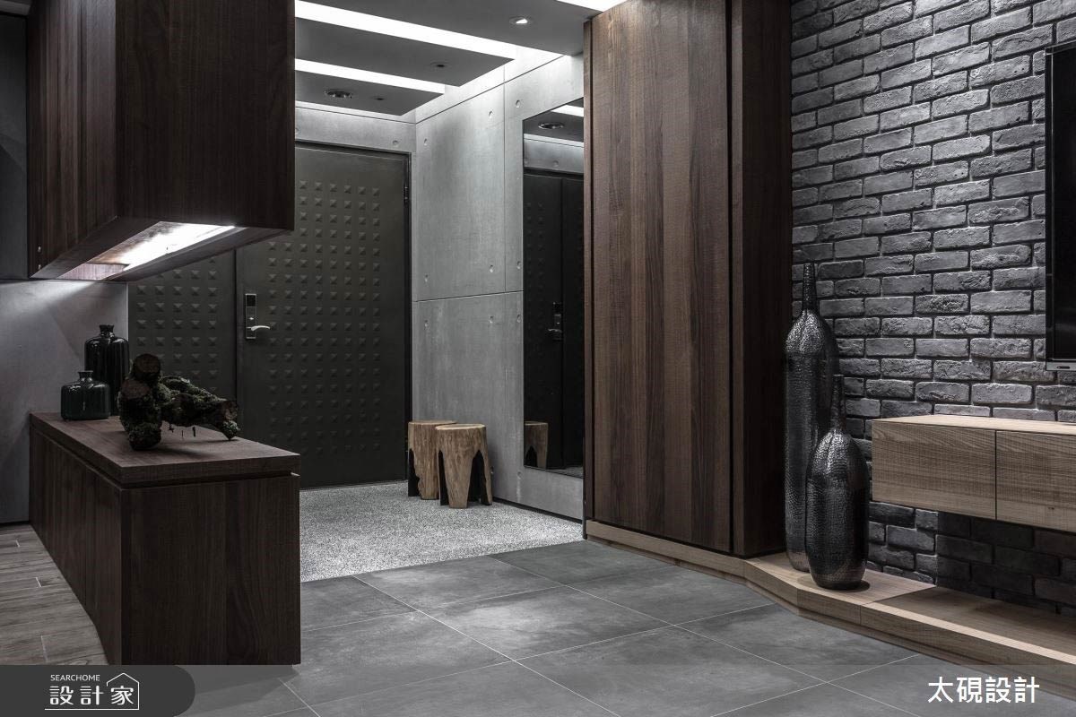 有別於一般對於奢華風格的印象,設計師以清水模住宅的低調灰階作為基調,搭配深棕色木皮詮釋住宅質感。玄關仿清水模牆面搭配地面的磨石設計,電視主牆選用文化石與客廳鐵灰地磚奠定沈穩的氣氛,將中西建材融為一體。