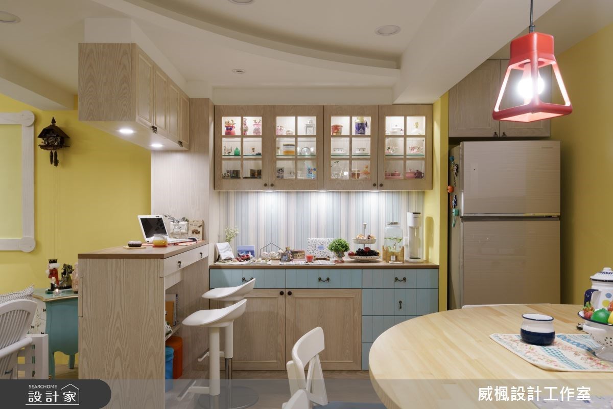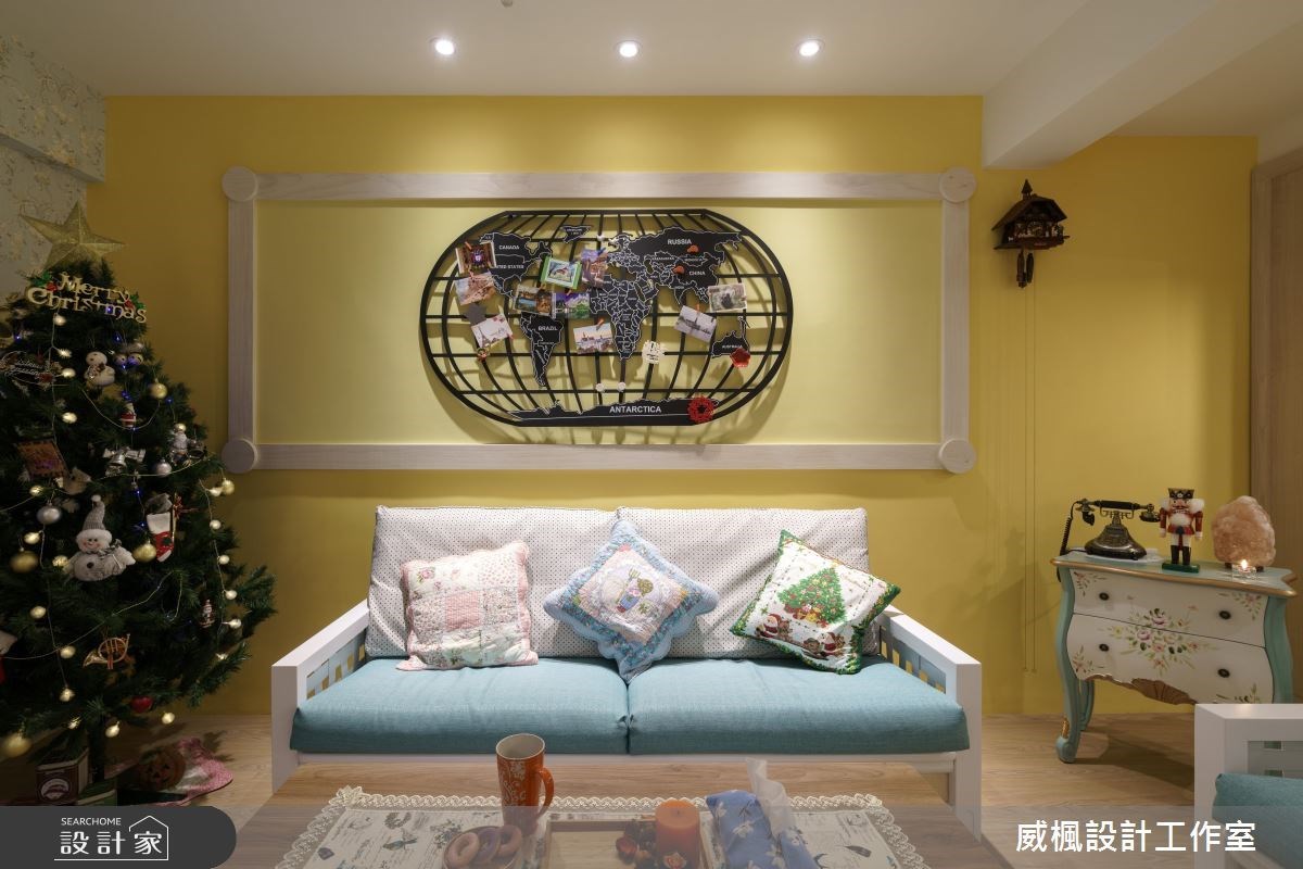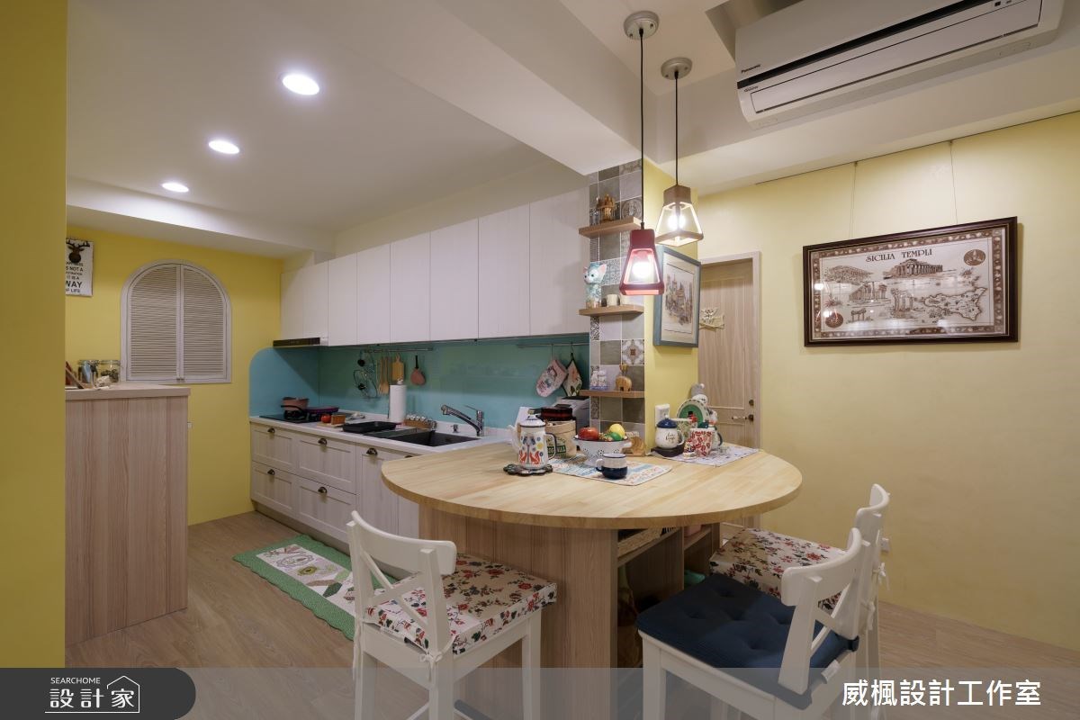踏入玄關,陽光灑在簡約的花磚地坪上,和木質玻璃推門形塑落塵區,建構寧靜美好的迎賓畫面。公領域內,注入大篇幅的鵝黃,搭配樸實的木地板、輕盈的碎花表情,寫下浪漫卻自然的清新氣質,也刻劃出活潑的愉悅調性,視覺亮點集中在沙發背牆的地圖陳設,可將出國旅行的回憶照片妝點其中,為空間增添了一絲暖意,又十足顯現屋主的個性魅力。餐廚區域,利用收納式的簡易吧台作為場域界線,餐桌銜接結構柱體,並加入展示機能,讓杯盤蒐藏、紀念小物成為最獨特的居家端景;揭開對側的百葉窗面,戶外的綠意、陽光與空氣一同遊走於室內,描繪出悠閒而愜意的用餐情境。