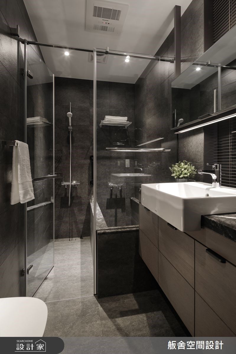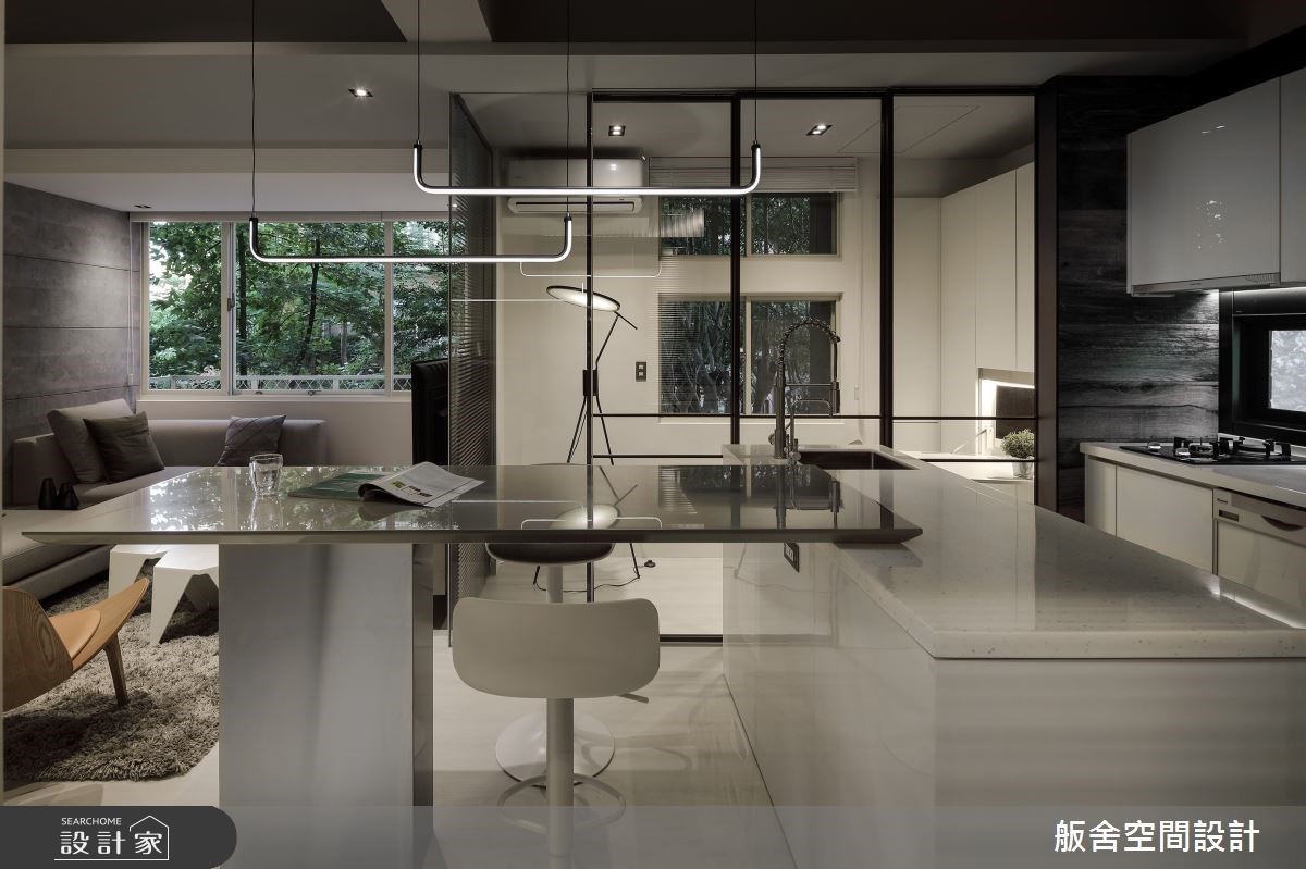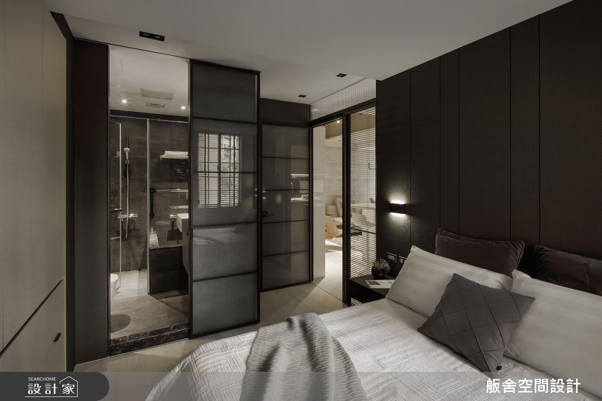 中島是家人情感交流的地方,利用與餐桌整併的手法,讓餐廳與廚房空間合而為一,提高空間坪效,且完整使用機能。廚房的另一側規劃主臥室,同樣以金屬框玻璃門做為隔間,以深色為基底的主臥空間裡,持續藉由金屬框玻璃的隔間手法,區隔睡眠與衛浴區,讓有限空間仍可展現開放、流動的氣息。