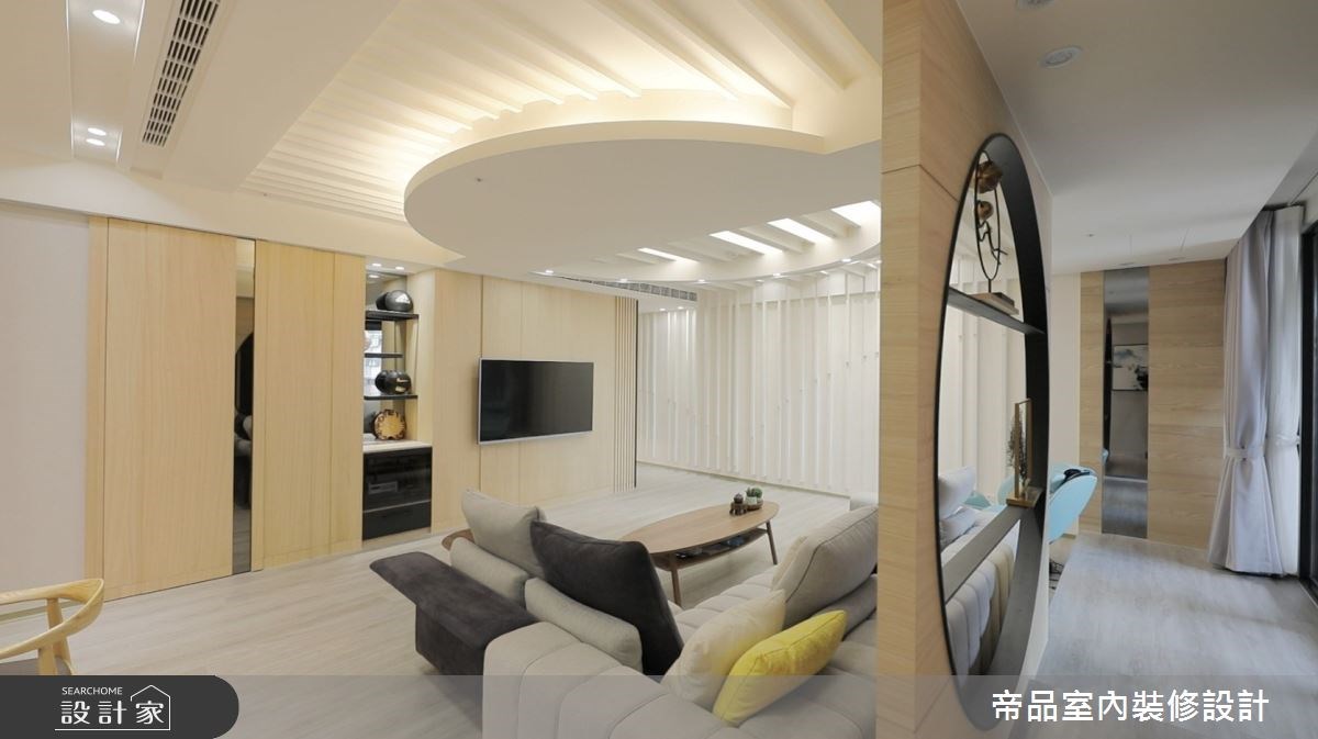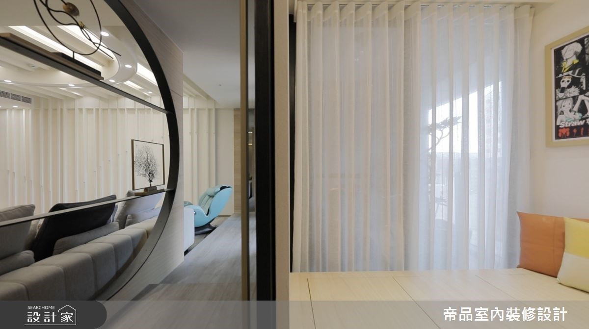 走入玄關,牆面鋪陳綿延不斷的格柵,形塑富有生命力的律動感,更引導賓客入室,一路延伸至公領域的天花板,匯聚於象徵圓滿意義的圓弧造型,更藉機化解原本突兀的橫樑,而電視牆後方的結構柱,則利用深度差距,規劃為小型儲藏室,增添豐富的收納機能。公領域內,結合客、餐廳兩處,展現寬敞舒適的視野,與圓弧屏風後方的迴廊,劃出流暢悠遊的通透氣場;圓弧屏風透過縷空處帶入美好綠景和採光,使立面的木質材展現溫厚暖意。後方和室,架高地坪打造日式臥榻,淺淺訴說溫婉的東方風雅,內裡也配置升降桌、小書桌,創造品茗、下棋或小憩等豐富情境。