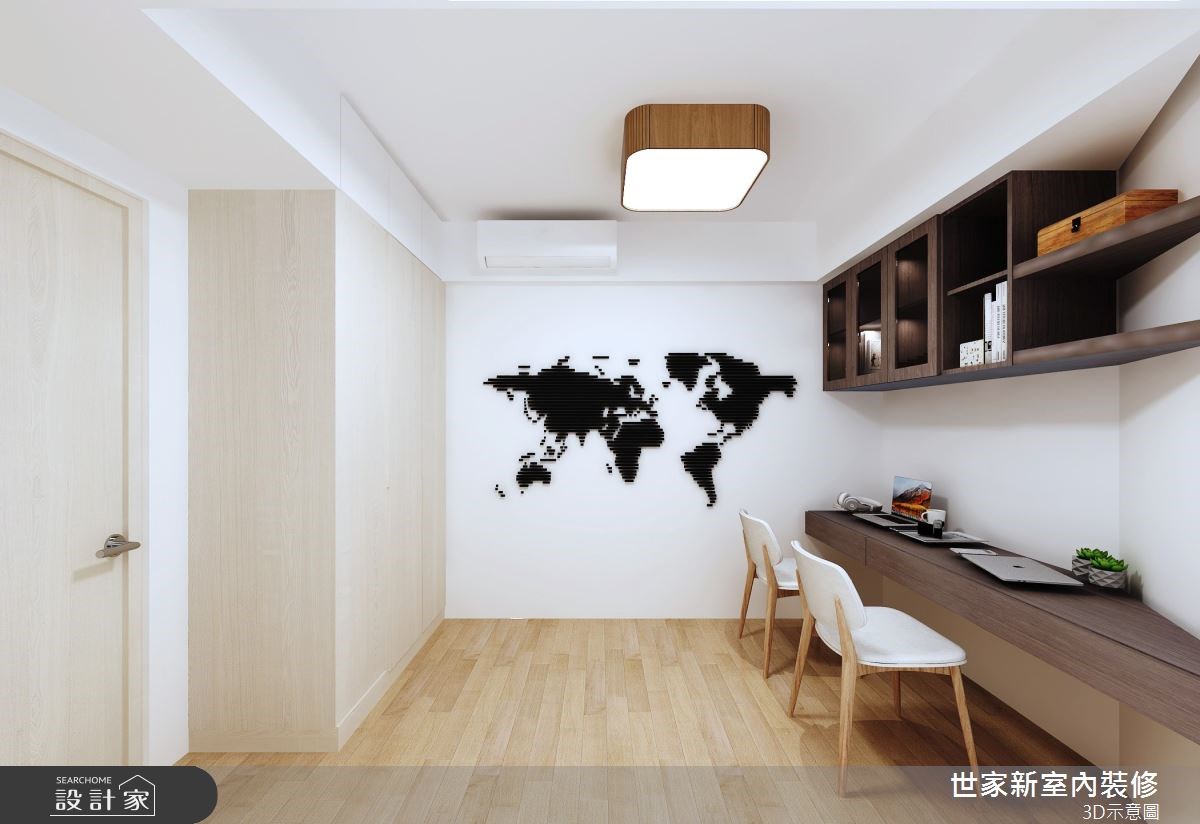 由於男女屋主平時有閱讀的習慣,以及在家工作的需要,在書房的規劃上也有足夠收納空間,牆面設置大型系統櫃體收納雜物,書桌上方則設計吊櫃採開放展示,放置平時會使用的工具書,書房空間也特別鋪設木地板,將來有親朋好友來家裡住,也能轉變為客房。