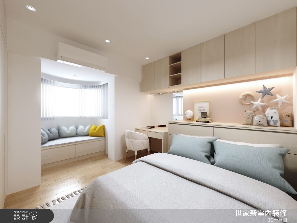 2坪兒童房也能有滿滿收納空間!設計師使用坐臥平台當床架,上方為床鋪,下方設計抽屜櫃放置玩具或過季衣物,使用樑下空間設置床頭櫃,連結書桌與衣櫃之間的畸零空間,設計師也將其打造為書櫃空間,讓每個角落都發揮到最好的功能!