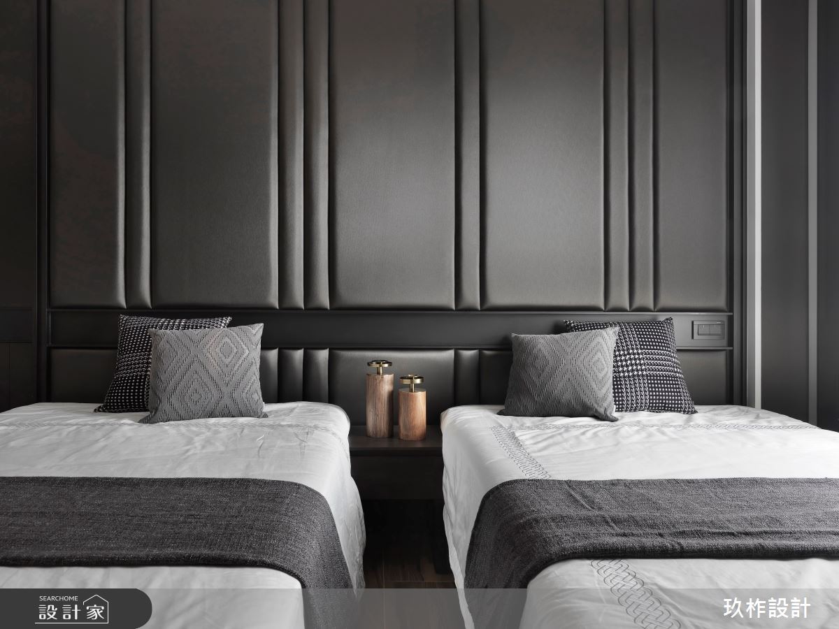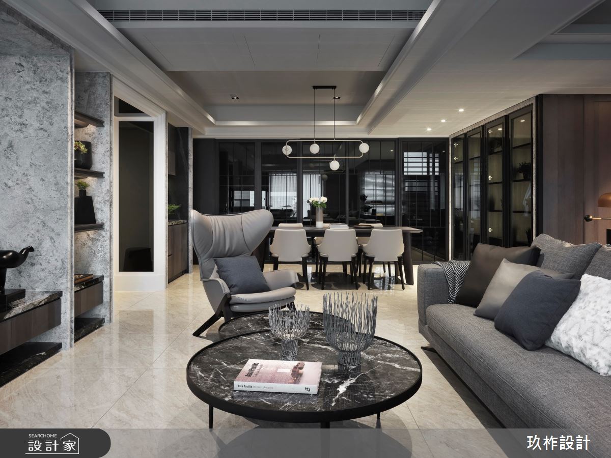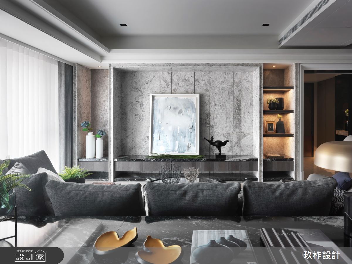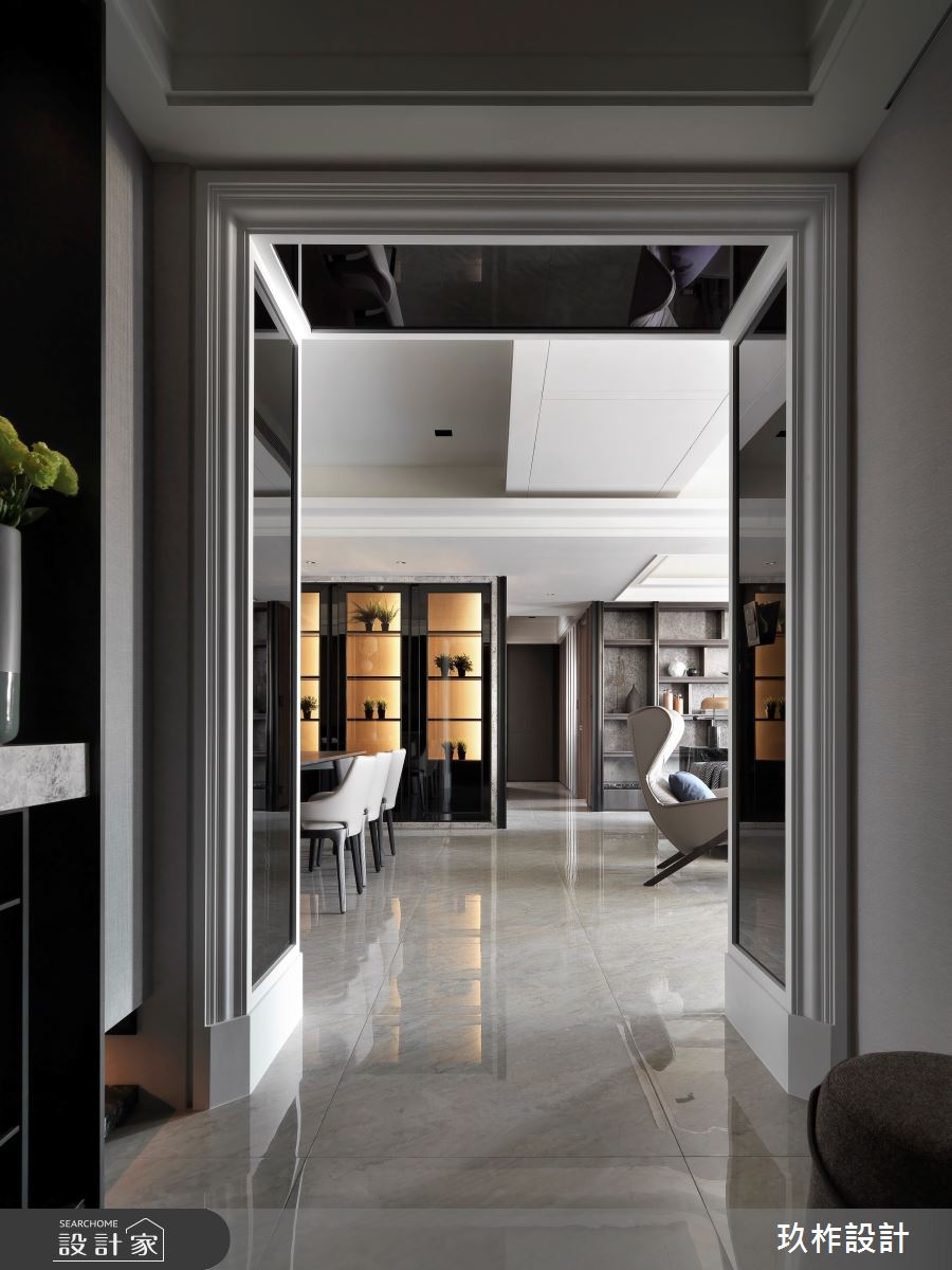 大門入口處,運用線板門框、鏡面劃出玄關廊道,優雅大方的風情迎面而來;公領域全室透過造型、燈光及細膩的設計,打造優雅的都會風情,並選用帶點斑駁懷舊感的立面建材,援以燈光的烘托,更顯天然粗獷之美,織就多重層次;書房以開放形式存在,放大公共空間感 ,整面書牆收納美觀與機能兼具,不論放滿或留白都形成一幅美麗的端景;餐區則透過大幅度橫向黑鏡的設計,有效拉闊空間尺度,旁側 將植物一格一格放入櫥櫃內,讓植物與燈光、擺飾等物件共同組織豐富的視覺體驗!