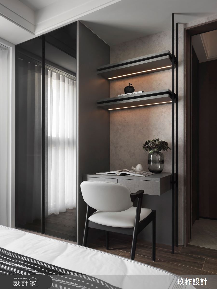 臥房善用櫃體旁的畸零空間,規劃為梳妝台兼書桌使用,並裝飾層板燈,營造出不同的空間層次感,實用且讓視覺顯得簡潔!