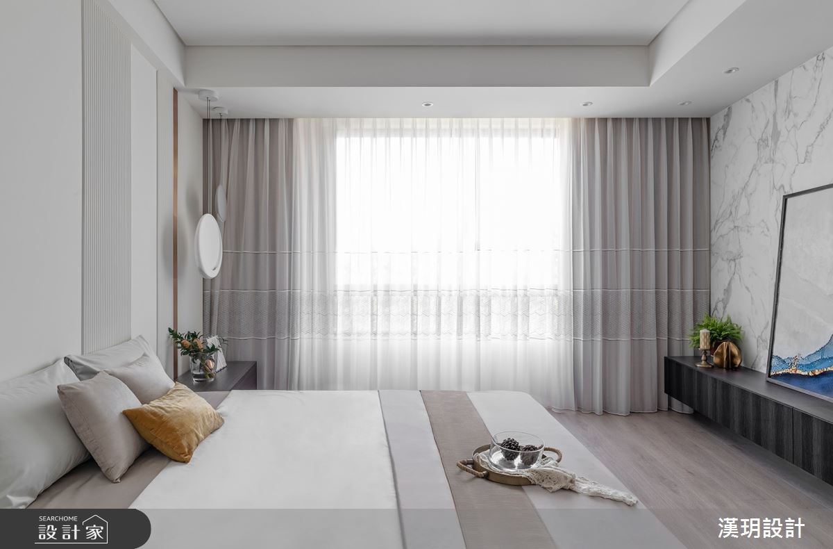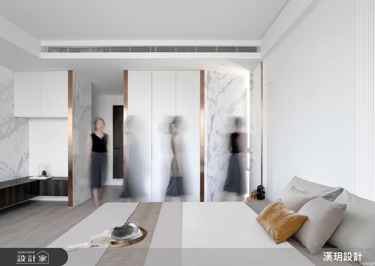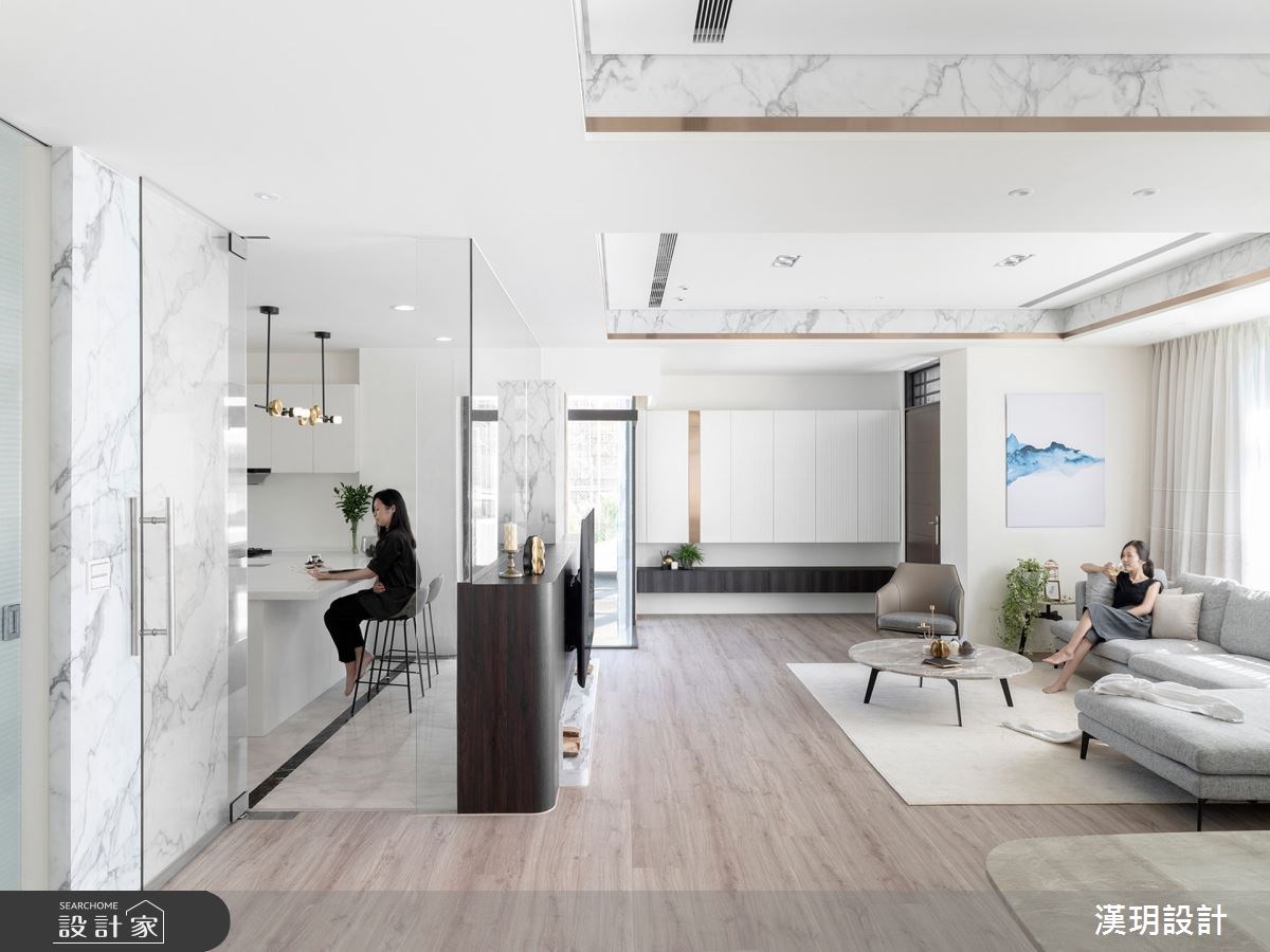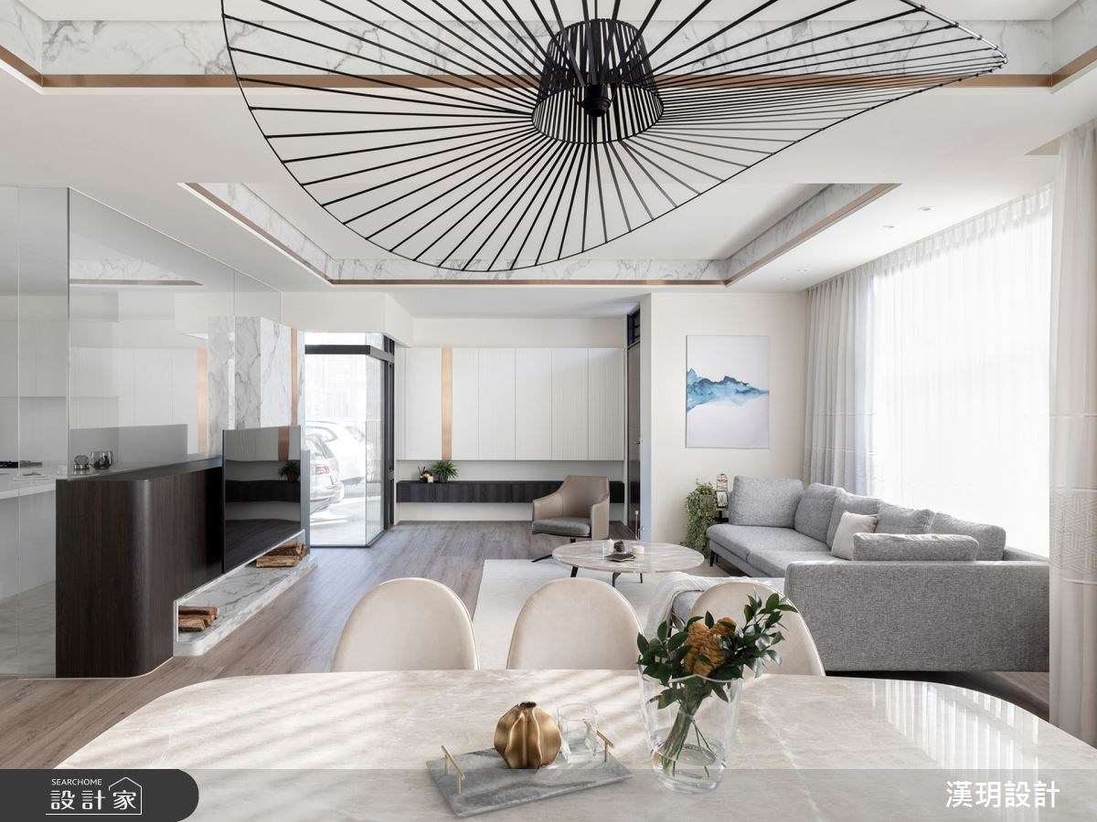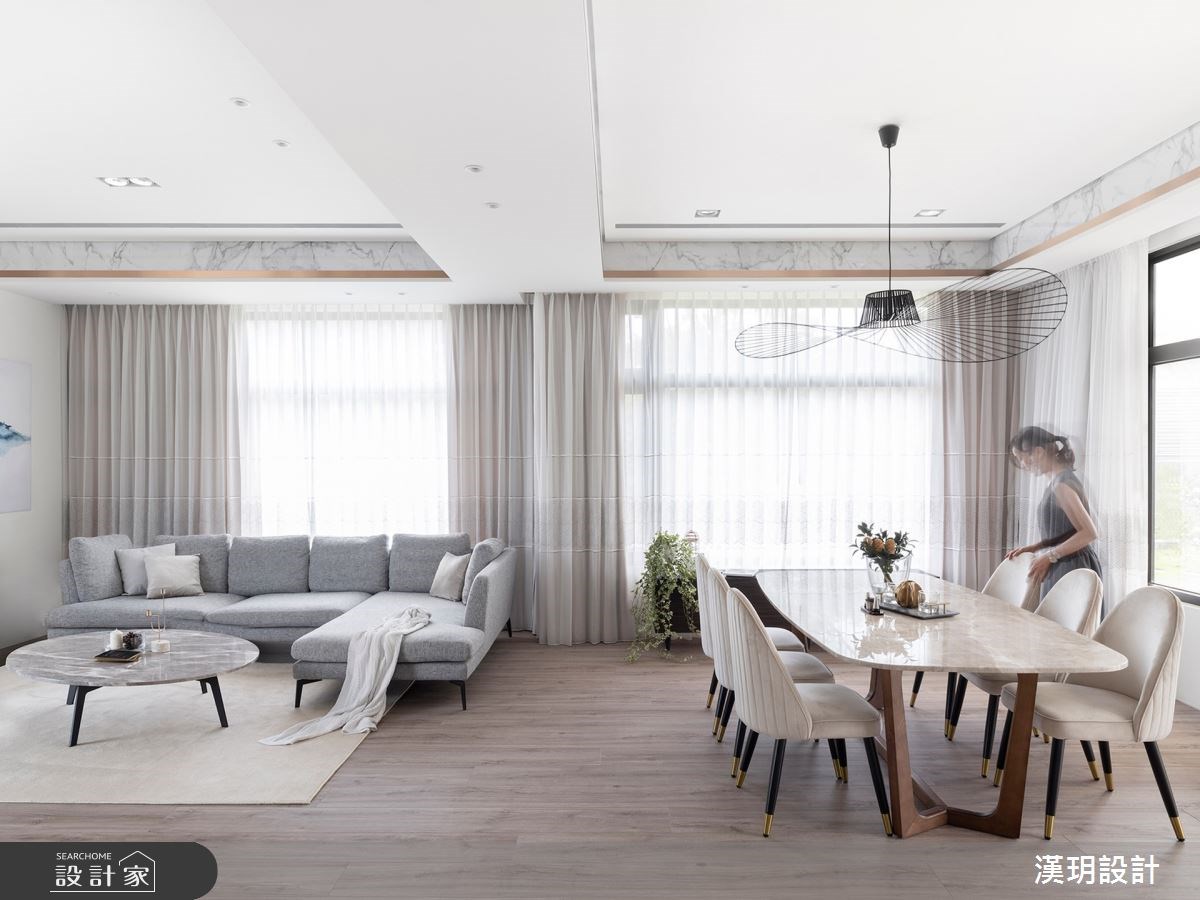 以輕裝修的概念設計獨棟別墅,系統板材、玻璃、大理石紋交疊堆砌出白色的層次感。點綴在牆面和天花板的鍍鈦金屬則呼應木地板與透光窗簾的裸色調,用極簡的建材搭配活動式家具,讓獨棟別墅可以活出各種不同的變化性。