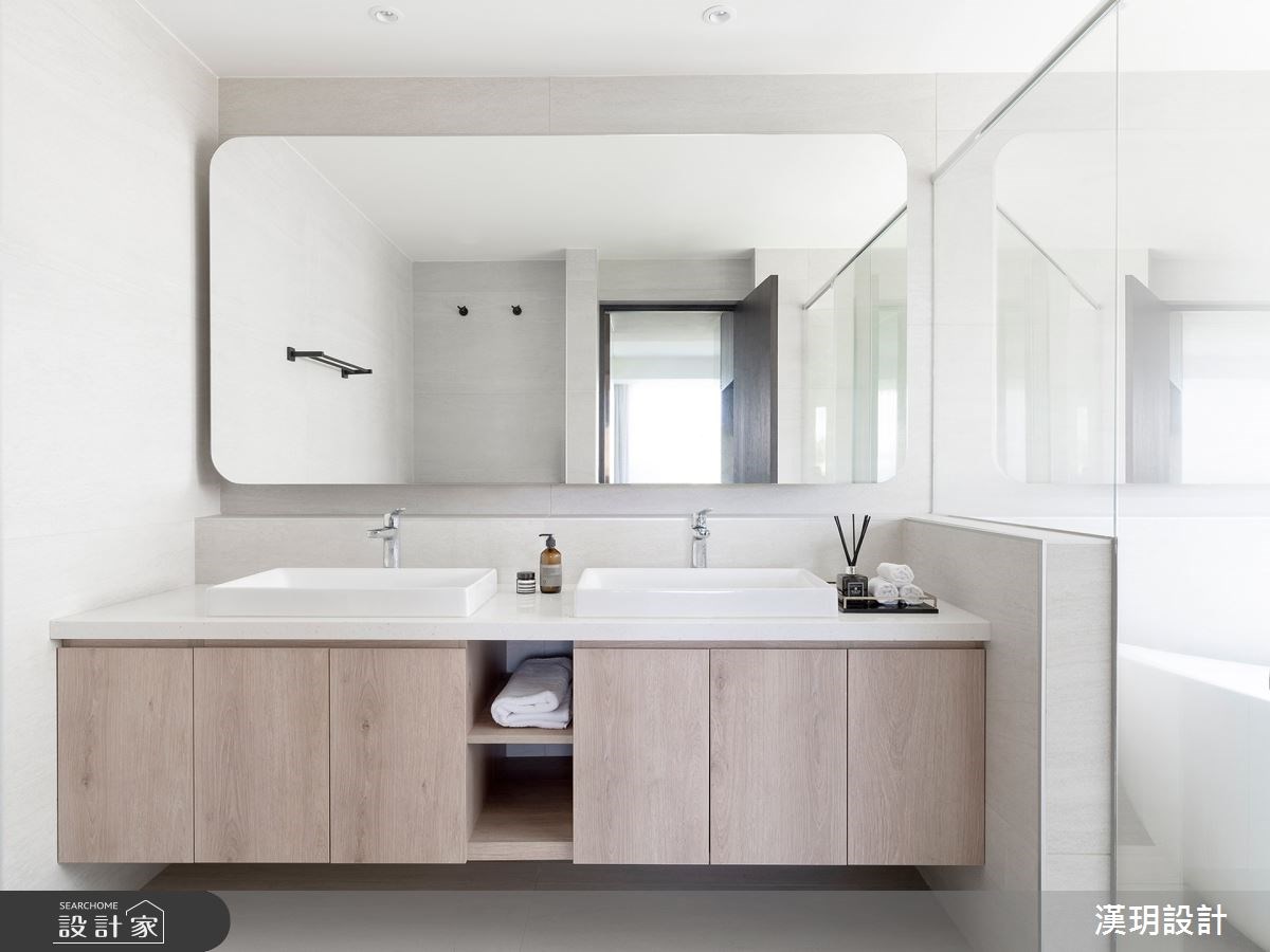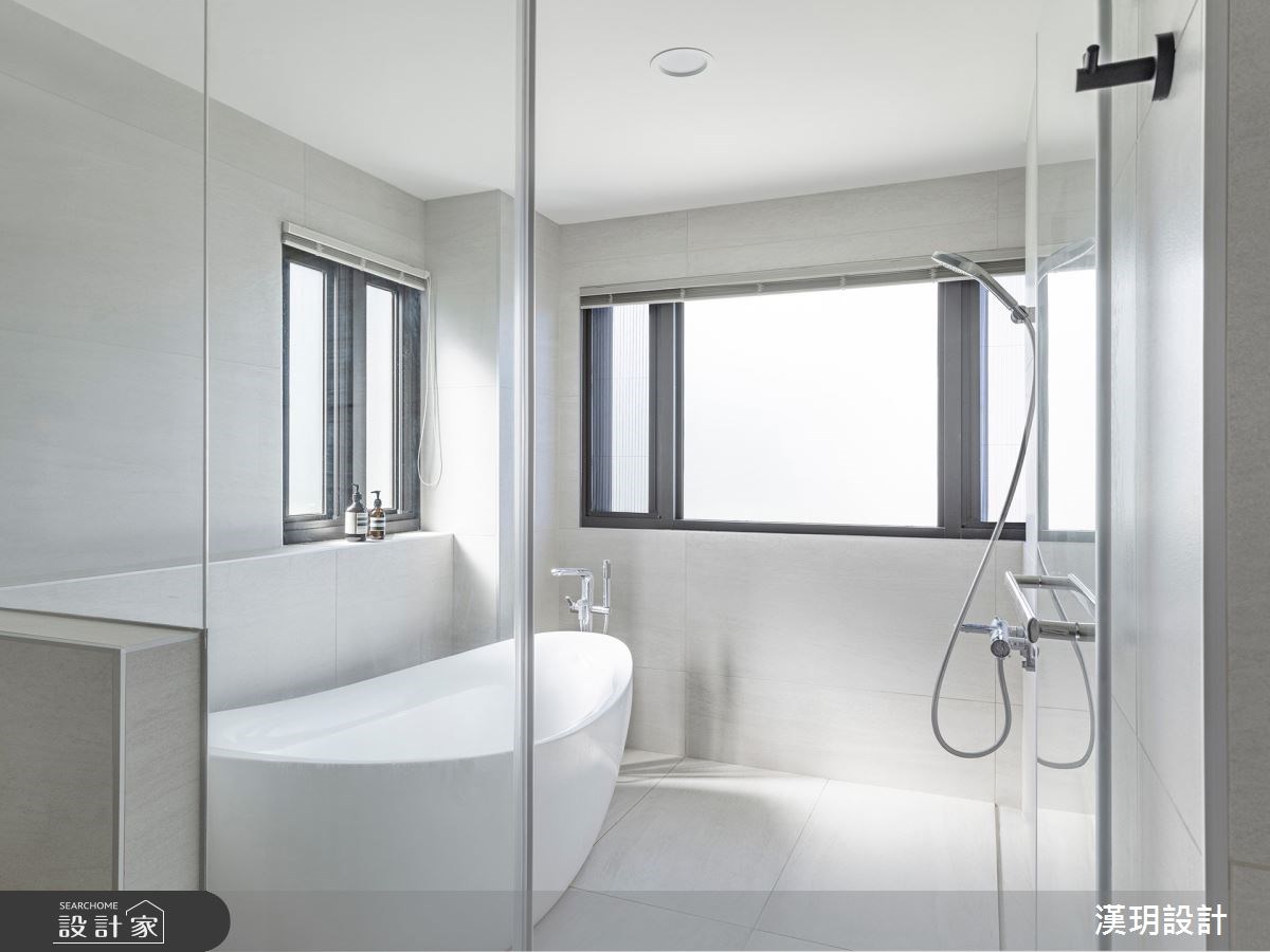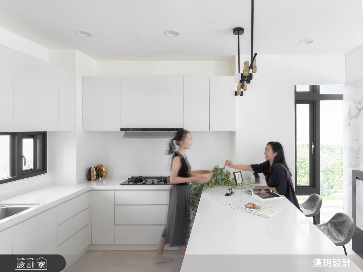 除了用妥善規劃收納來放大空間,玻璃取代實牆隔間在一樓打造出三面開窗的角落,將採光與綠意引入室內;中島廚房設計在玻璃半高電視牆後方,連同門片也使用玻璃材質將空間最大化,讓封閉式餐廚擁有好採光、好通風以及與客廳良好的互動關係。欲維持簡約無壓的空間,在臥室設計上利用隱形設計將浴室與更衣室的門片隱藏起來,利用鍍鈦板修飾門片切割,賦予空間簡潔清爽的視覺,又能做到使用機能的便利與順暢動線。衛浴採取雙洗手台設計方便一家四口使用,下方浴櫃也是對稱設計,兼顧視覺上的平衡美感也讓家人分區規劃更鮮明。濕區將淋浴間與浴缸用玻璃隔間和洗手台做區隔,利用窗台自然形成置物平台,讓家人可以在陽光下沐浴。