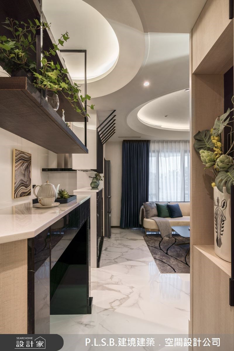 憑藉著建築專業背景,建境建築空間設計將三房兩廳的 21.5 坪毛胚屋以減法設計將格局改為兩房,騰出更多空間在小宅裡規劃開放式餐廚吧台椅以及寬敞客廳,並以飯店式風格包裹公領域,讓需要國內外往返的屋主能保有工作居住飯店的熟悉感、也能體會到回家的歸屬感。