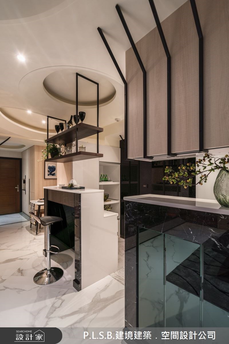 玄關規劃櫃體蘊藏大量收納機能,大地色系木皮形塑無壓的空間感受;利用玻璃與造型鐵件,降低收納櫃的壓迫感,也像是歡迎屋主回家的意象。在空間佈局上運用隱藏設計將客廁入口巧妙融合於牆面;通過玄關的過場轉換心情之後,迎接家人的是溫馨的餐廳空間。將原本封閉式的廚房打開,運用一座高吧台取代隔間牆,串連餐廚空間外也讓機能可以混用,上方吊櫃可以擺放杯具器皿、下方高吧可以成為被餐台或輕食吧台,變化出更多元的生活模式之外,電器櫃也能安排在更妥善的位置,讓小坪數也能擁有舒適的料理動線。