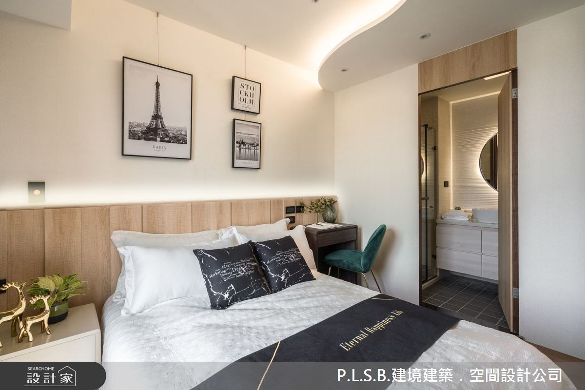 主臥選擇溫潤的大地色暖棕,達到睡眠的安定,空間內立面的比例分割不僅替造型加分,也隱藏了主浴入口、優化視覺與化解風水疑慮。天花板流動的弧線如海浪拍打岸上,呼應客廳天花板的意象。次臥房採和室設計,在木地板下補足收納來放置換季衣物與被褥等居家用品,也能作為孩子的遊戲室、靈活設計能因應小朋友的成長階段。