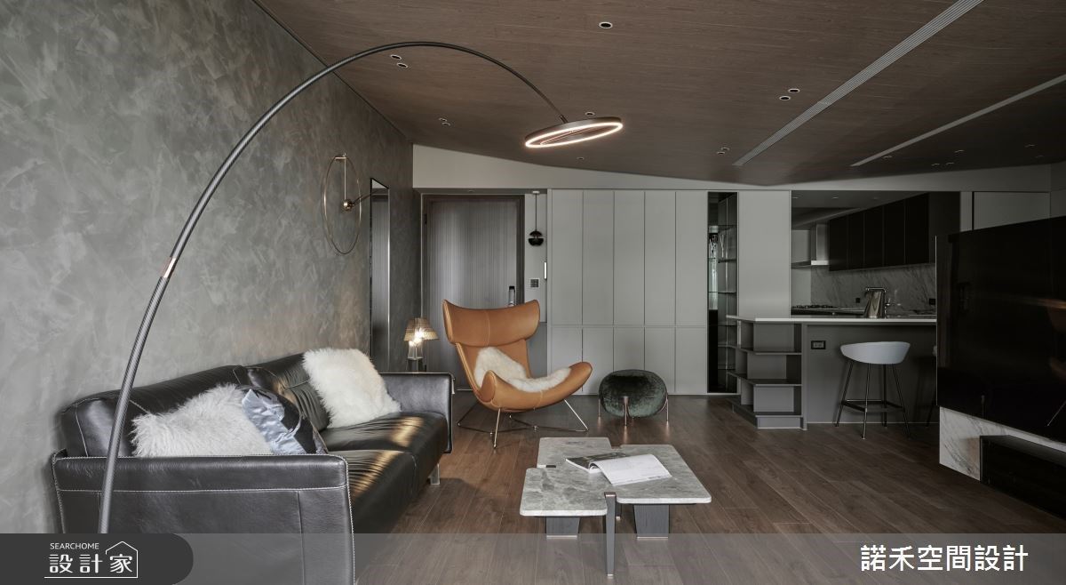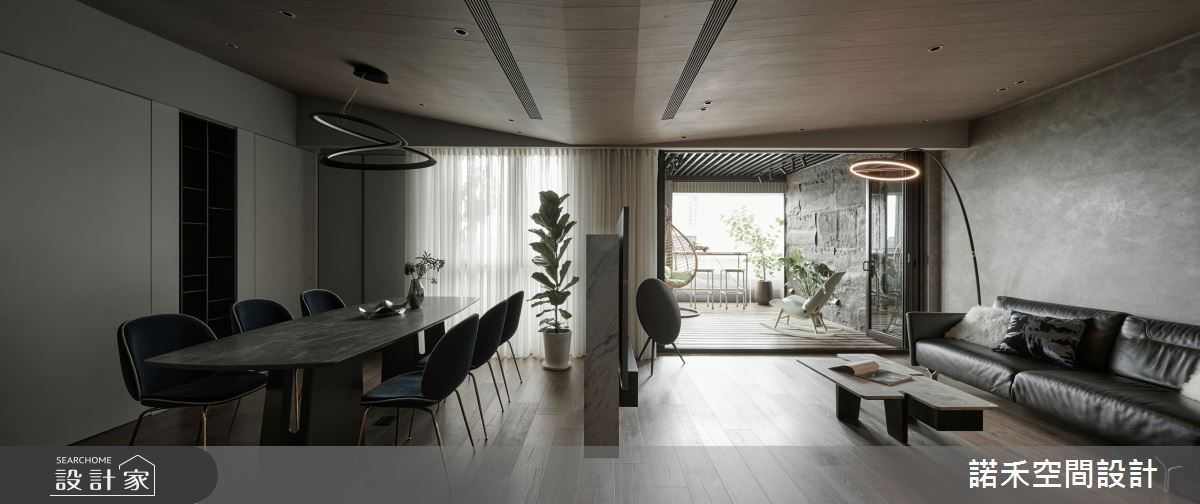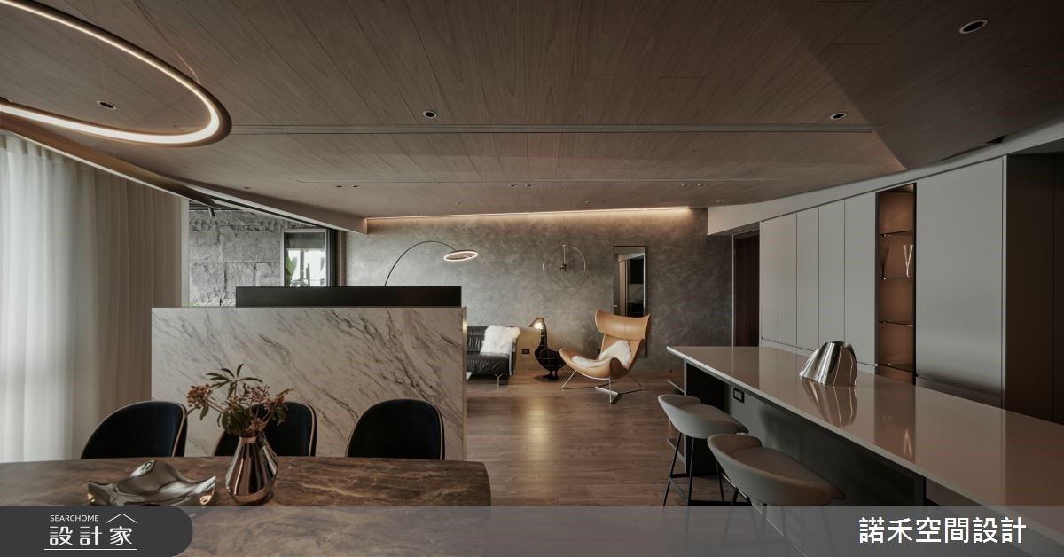 由於室內巧遇大樑結構體,以電視牆為核心,向兩側傾斜木紋的天花安排,延伸出寬敞的空間視野。客廳背牆飾以藝術漆,搭佐深色皮革沙發、單椅與簡約線條的燈飾,激盪出現代風與美式風的獨特情懷;一旁的露台以架高木地板模糊內外分野,並利用全開式摺門適時界定,且特別安排吧檯與桌椅設計,創造出屋主夫妻倆日常互動的休憩角落。電視牆以懸空、半高並縮小量體的設計巧思,串連客廳與餐廳,讓整體空間更顯輕盈、流動。