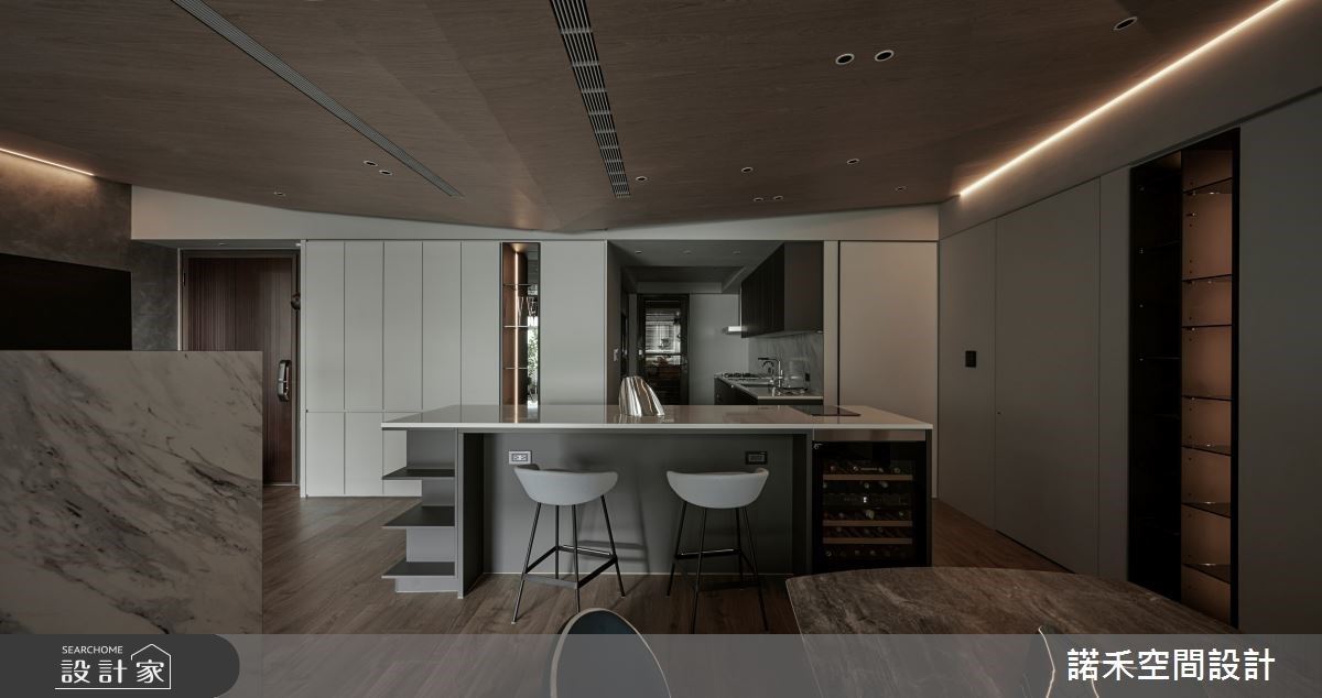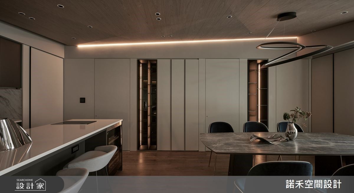 而考量原本的餐廚空間距離過遠,設計師透別挑選3米長的大型中島串連廚房與公領域,意外的成為家人最喜歡聊天互動的場域,情感隨之增溫!收納也是空間的設計重點之一,入室後的玄關,以整排鞋櫃串連廚房空間,且收整天際線條;餐桌後方打造奶茶色櫃體,並串連通往私領域的隱藏門與展示機能,全方位整合機能與視覺美感。