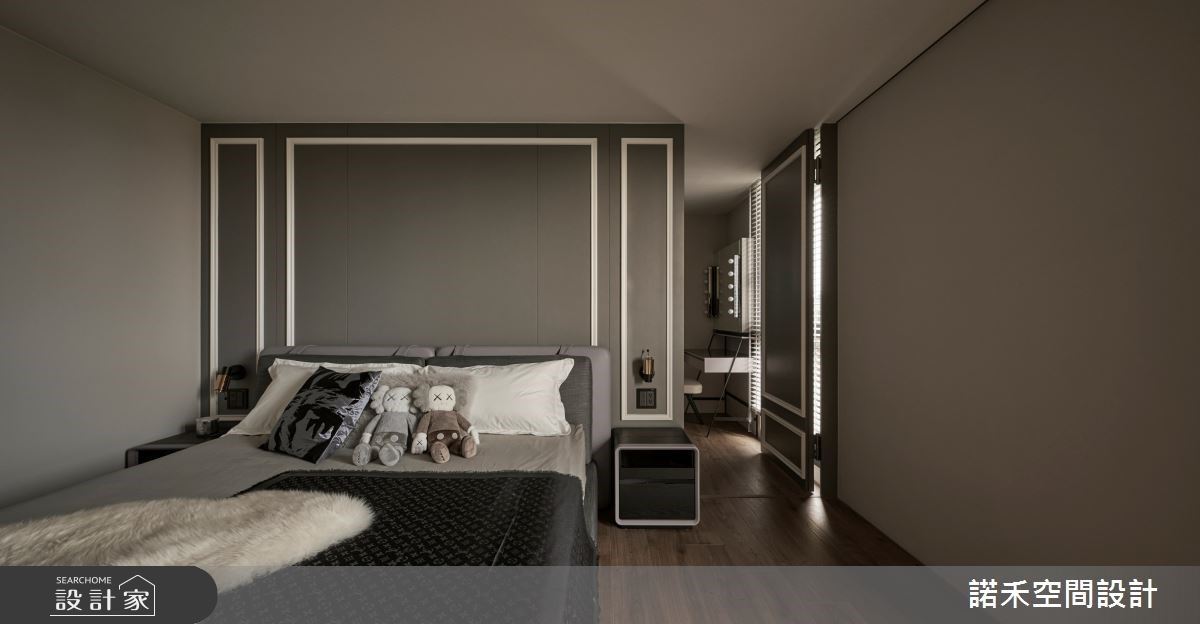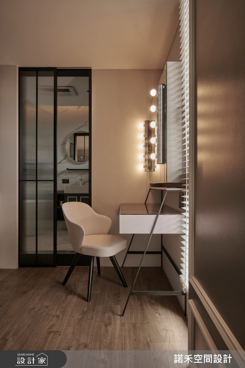 主臥空間裡,以美式線板描繪出對稱、和諧的床頭造型,一旁則利用隱藏門規劃更衣室,米白色梳妝台搭配燈泡照明造型的鏡面設計,營造出柔和、純粹的舒適氛圍。
