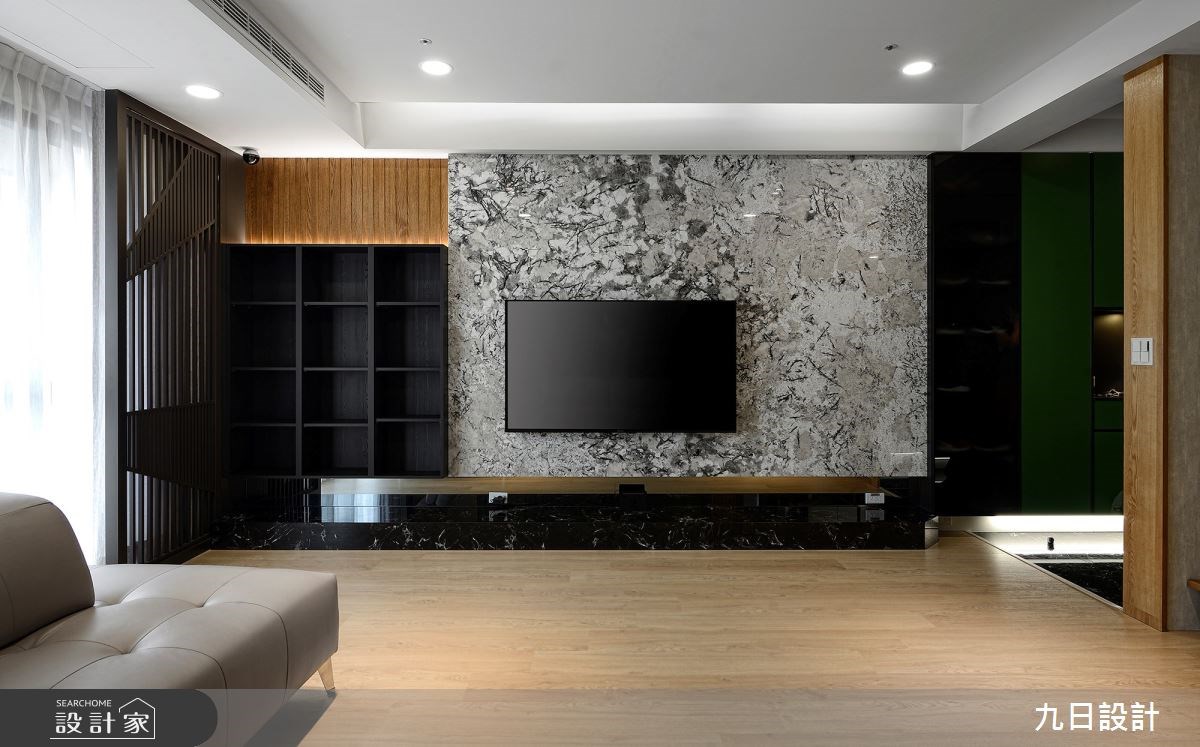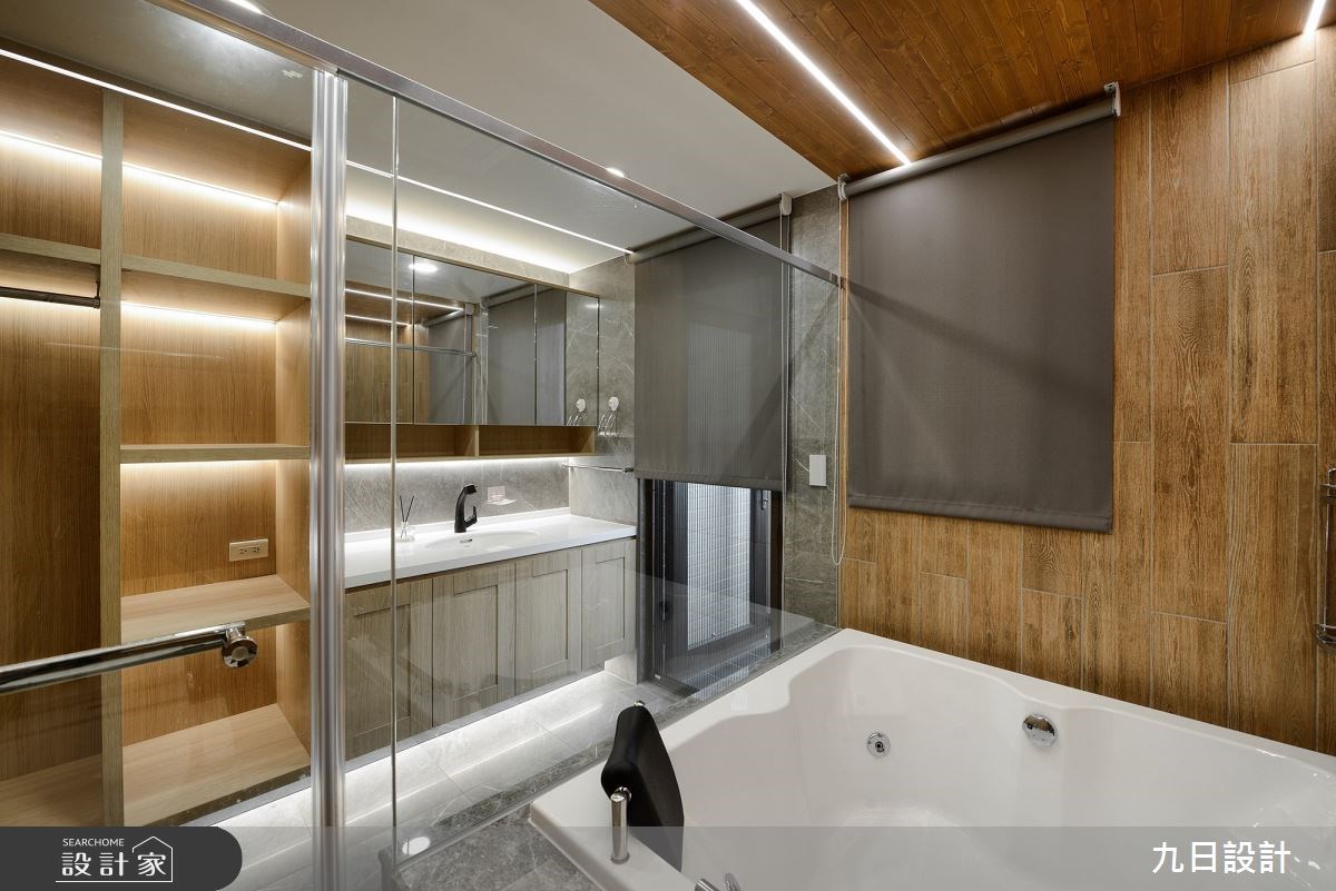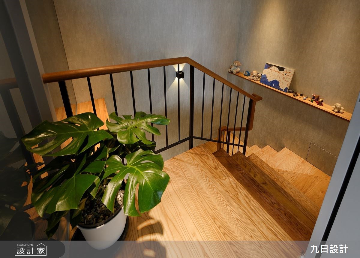 在樓梯逐步完成之後,設計師才可以著手進行二樓的空間改造,而在梯間的牆面上,設計師選擇了展示層架去擺放公仔,為居家增添一絲童趣。二樓空間透過石紋電視牆,劃分出起居室和主臥,讓夫妻倆可以在起居室跟小孩玩耍,累了回到房間休息,冬天還可以泡進溫暖的浴缸熱水裡,享受愜意的私密時光。