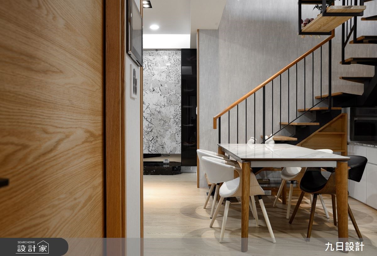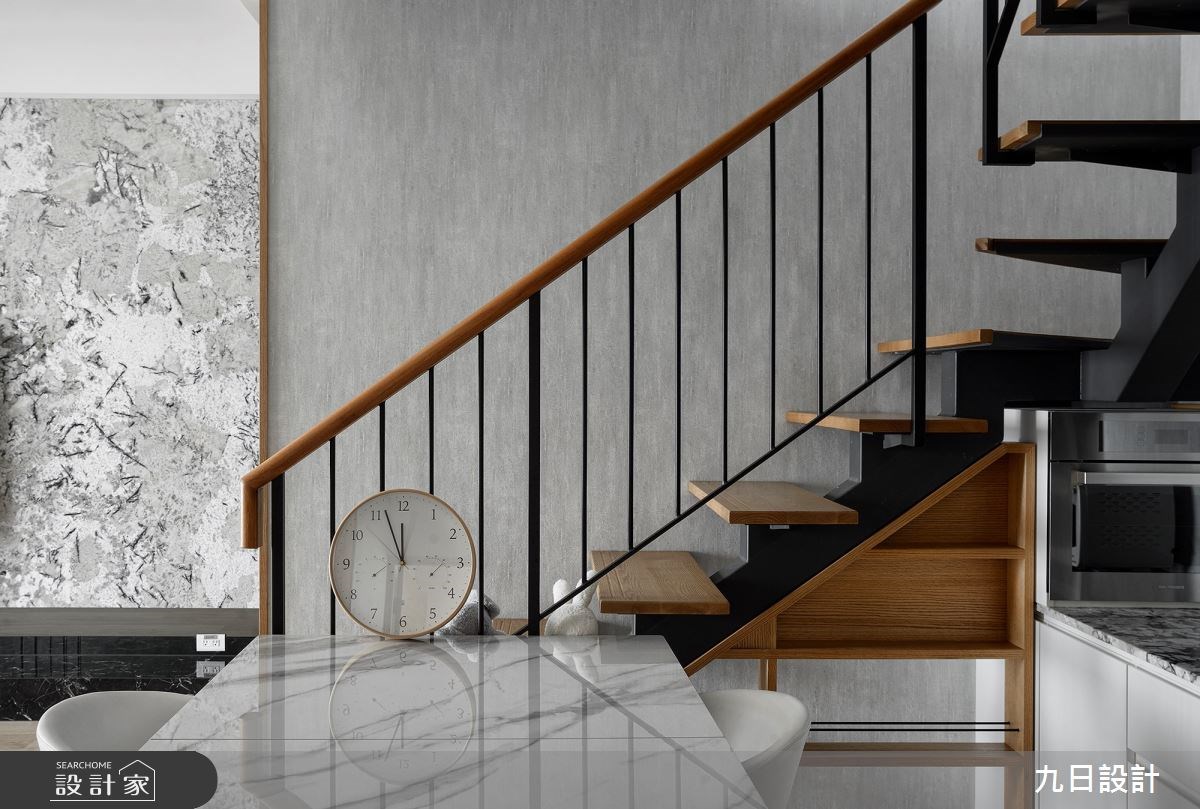 設計師將室內分為上下兩層,下層為長輩較常使用的場域,上層則為夫妻倆的專屬放鬆空間,而連接不同世代生活的樓梯,由於不符合屋主需求,所以整座拆除重做,無論是結構的支撐、角度和斜度,全都予以重新計算,同時滿足屋主想要鏤空穿透感的階梯設計,甚至還利用梯下畸零空間,去整合餐廳的收納櫃,讓動線、機能與美感三合一。
