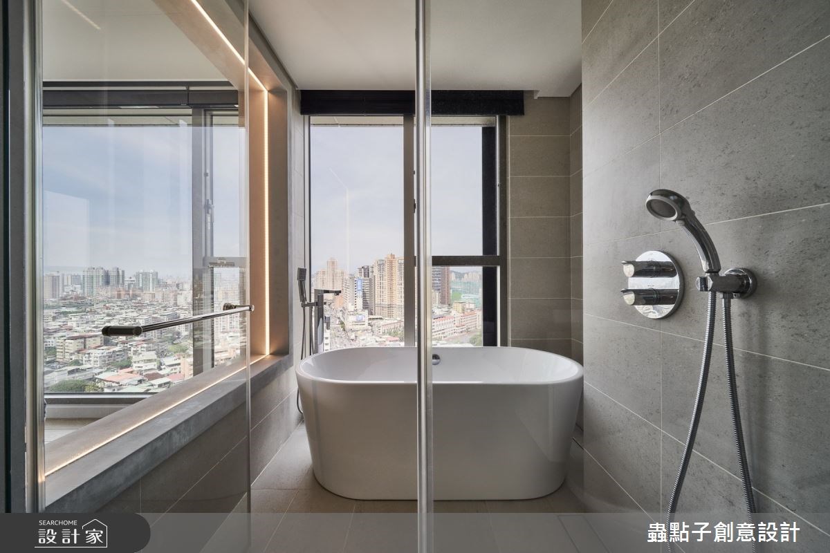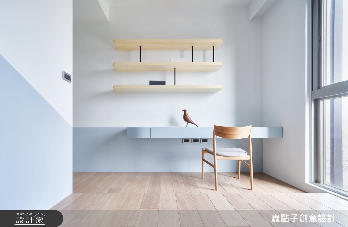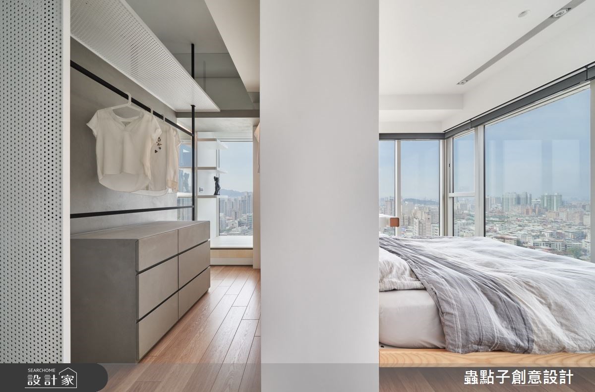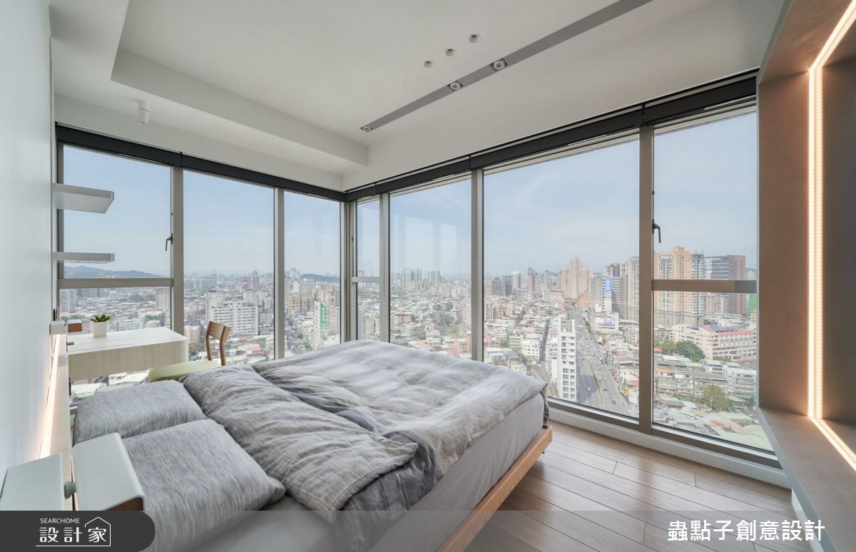 主臥在兩面開窗的景觀圍繞下,利用床頭牆的玻璃區塊,讓人能夠從書房穿過更衣室、臥室,看見窗外的城市景緻,而比鄰的浴室也採取玻璃隔間,使空間變得寬敞、視野零死角,又能保有一定隱私。另一間臥房則以淡藍色妝點主視覺,平常能夠作為客房使用,未來若有孩子出生,也能成為陪伴成長的兒童房。