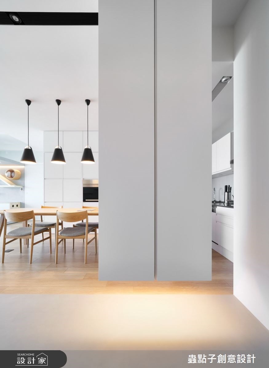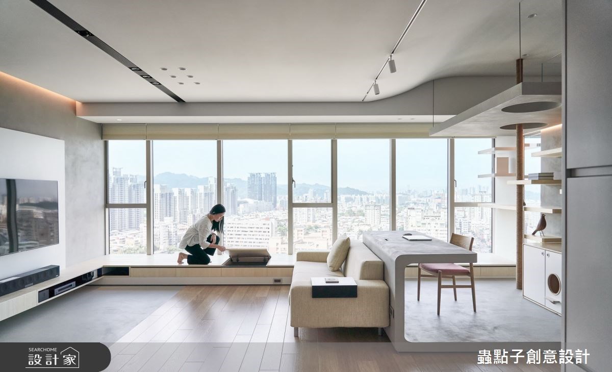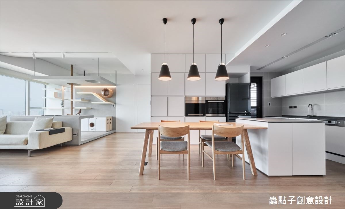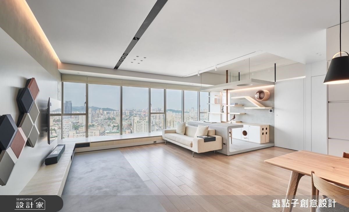 32 坪簡約風住宅的屋主是一名牙醫,平時工作忙碌的他,希望回到家能跟老婆有個簡潔舒適的空間,而且因為入住後有養貓的計劃,所以設計師結合住宅位處高樓層的景觀優勢,量身訂製明亮開闊、收納機能充足的 2+1 房寵物宅。
