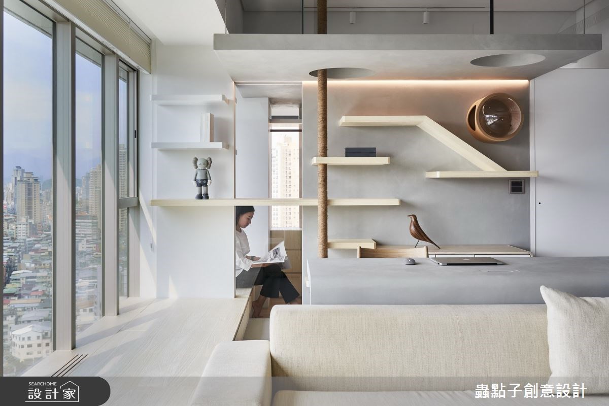 客廳電視牆在靠玄關處,融入洞洞板與層板的實用搭配,呼應餐廳的輕隔間設計,而長型電視櫃則延伸到窗邊,轉化成放鬆休憩的質感臥榻。臥榻採用上掀式的收納設計,讓雜物能夠更有效地收納整齊。沙發後方則規劃開放式書房,並藉由設計師擅長的折板手法,創造人貓共處的有趣場域。此外,天花板刻意地弧形拉高,讓貓咪可以在書房上方,自在悠閒地來回走動,不受干擾。