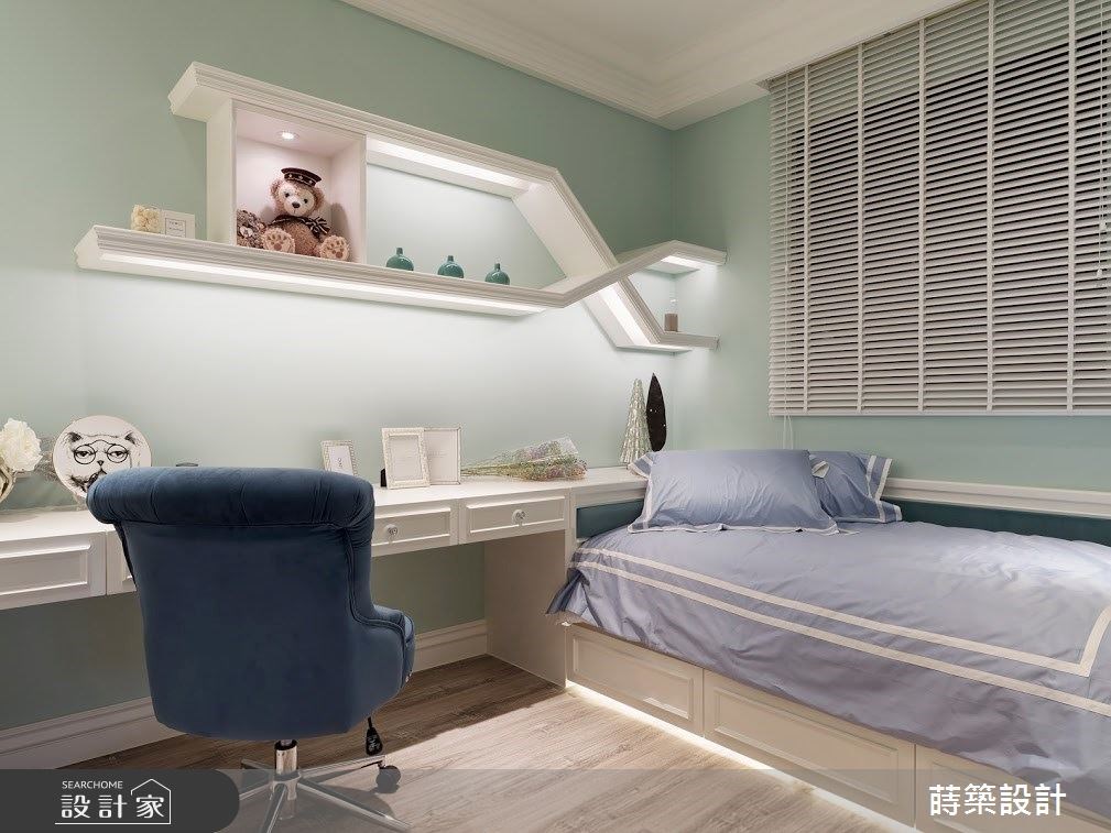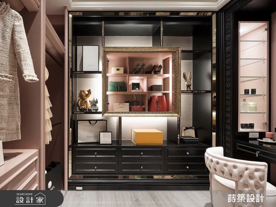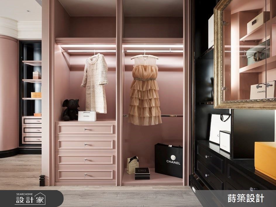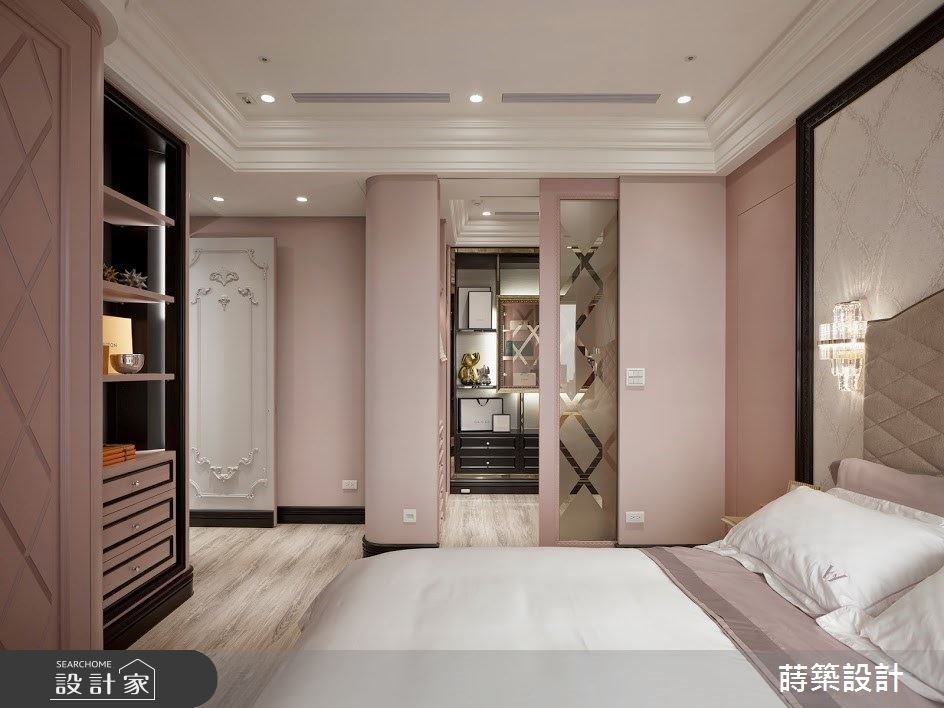 設計師在主臥挹注乾燥玫瑰粉的柔美,並以黑色作為色彩調節,妝點時尚迷人的空間氣質;更衣室延續主臥的顏色搭配.且利用畫框的藝術形式,打造女主人專屬的精品展示櫃。女兒房選擇 Tiffany 藍作為空間主視覺,床鋪則以窗邊臥榻的休閒造型,讓孩子可以在此自在放鬆、靜心閱讀。
