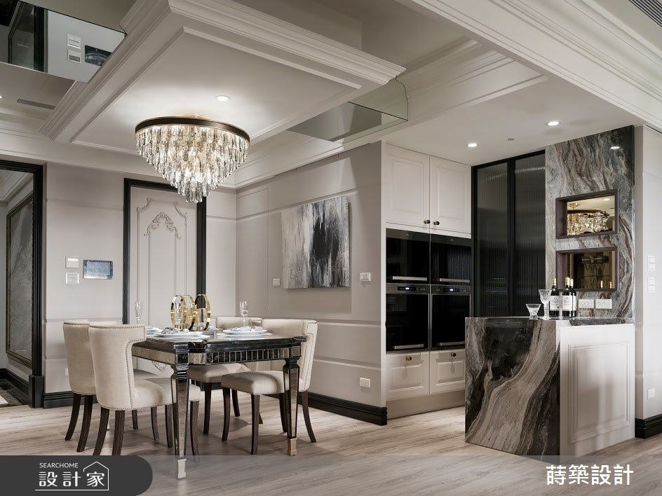 原先餐廳就有低矮大樑橫貫上方,設計師巧妙透過鏡面的包覆,去減輕樑柱的壓迫感,又能達到延伸周遭線板的效果,強調了空間的整體感。此外,考量到屋主一家早上喜歡吃輕食,廚房由封閉式的先天格局,改為輕食吧台與玻璃拉門相隔的熱炒區,這樣的機能配置不僅更符合生活習慣,空間也變得開闊許多。而吧台的石材挑選,與玄關的大理石端景相互呼應,讓優雅質感不斷延續。