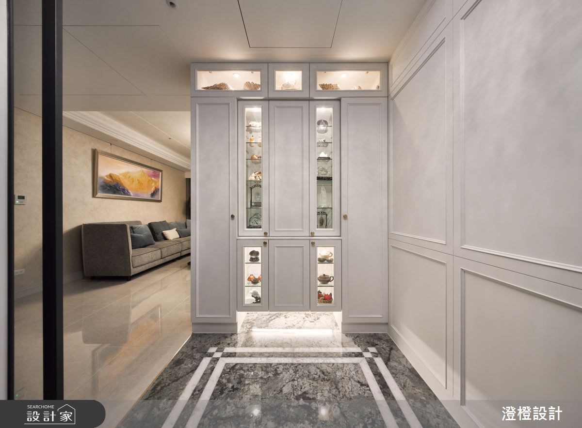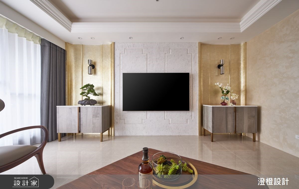 作為入門的第一印象,設計師在玄關處透過鞋櫃結合屏風的細膩手法,加上石材拼花地板的襯托,界定出氣度不凡的場域氛圍。客廳採取雪白的大理石妝點電視牆,呈現空間的高雅質感,石材上鏤刻的簡潔線條,則飽含成雙成對的美意;兩側弧形牆面鋪排細緻的金箔,搭配左右對稱的矮櫃,形成美感與機能兼備的特色端景。