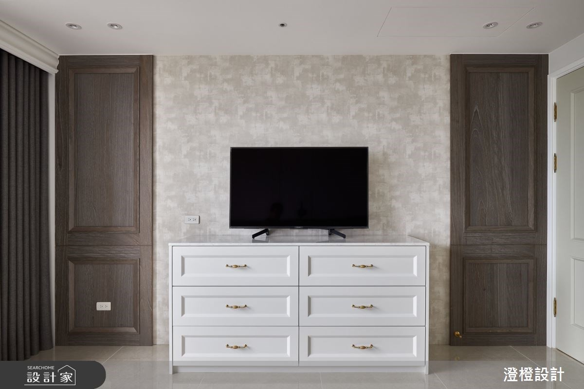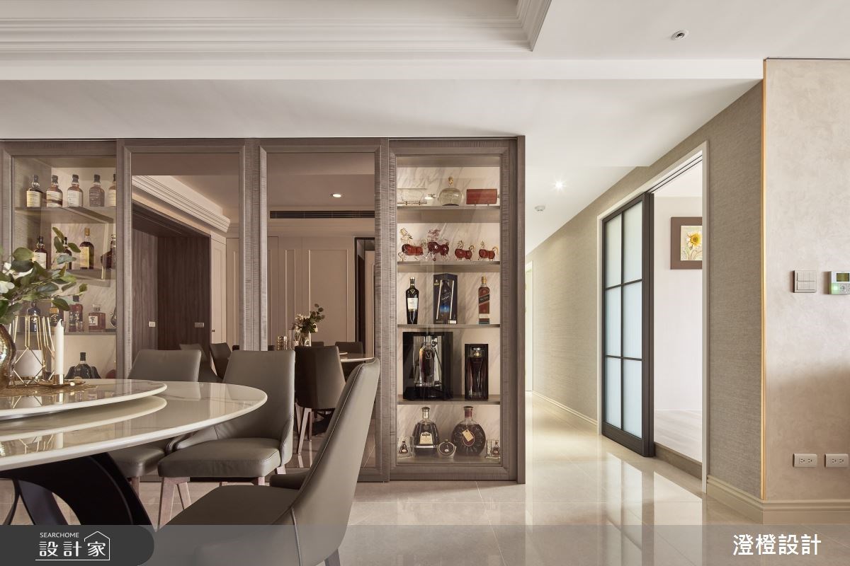 餐廳規劃一整面收納櫃,並在鑲嵌鏡面的拉門後方隱藏大量機能,延伸空間感的同時,也能俐落地收納各種雜物;兩邊的展示櫃則藉由柔和光源的烘托,擺放屋主的收藏品及酒類,讓生活與空間產生對話。主臥選擇咖啡色繃布裝飾床頭牆,牆面上方的白色線板與床尾電視牆的木紋造型,皆呼應新古典的設計主軸,而雙床的貼心設置,則巧妙提升退休夫妻的睡眠環境。