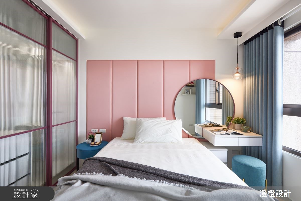 女兒房跳脫空間的低調奢華感,挹注粉色系的浪漫氣質,且於衣櫃採取玻璃門片,營造臥房的明亮開闊。客房在窗邊規劃書桌和展示櫃,將美好的日光留給閱讀時刻,而黑色鐵件的時尚質感,也呈現出飯店般的現代氛圍。