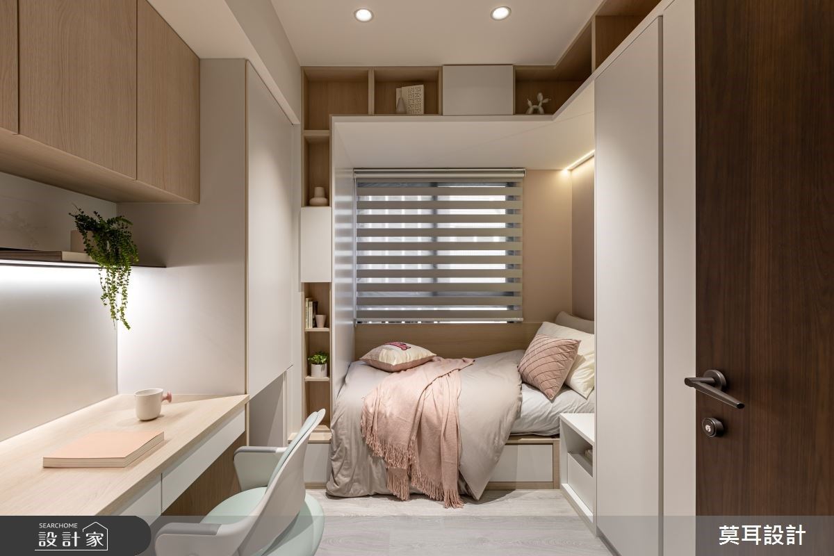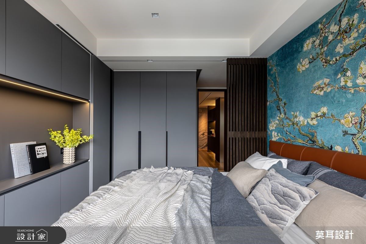 主臥房以格柵屏風增添睡眠空間的隱密性,繪製造型的藝術牆面則烘托出空間的柔美情調,展示收納櫃以鐵灰色與木質紋理相互搭襯,讓收納機能與生活美學自然地走入屋主的寢臥場域。
